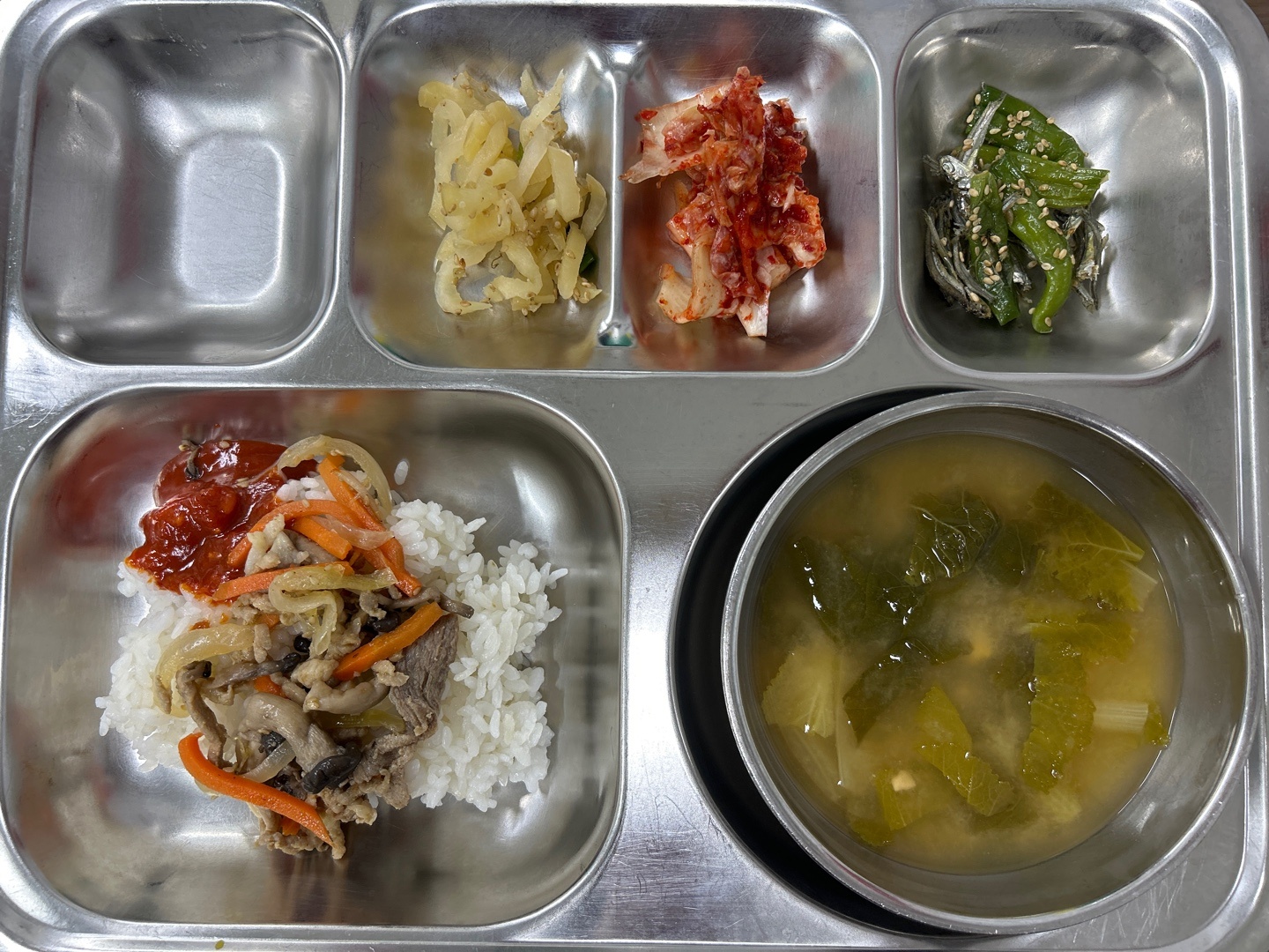- 야채비빔밥, 돈육민찌양념장, 얼갈이된장국, 무짠지채, 꽈리고추멸치볶음, 배추김치