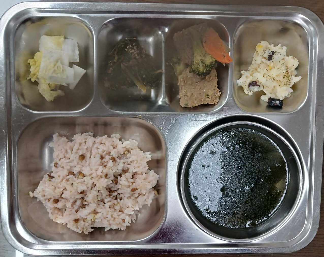 - 흑렌틸콩밥, 조갯살미역국, 떡갈비브로콜리볶음, 감자샐러드, 고추장근대나물, 백김치