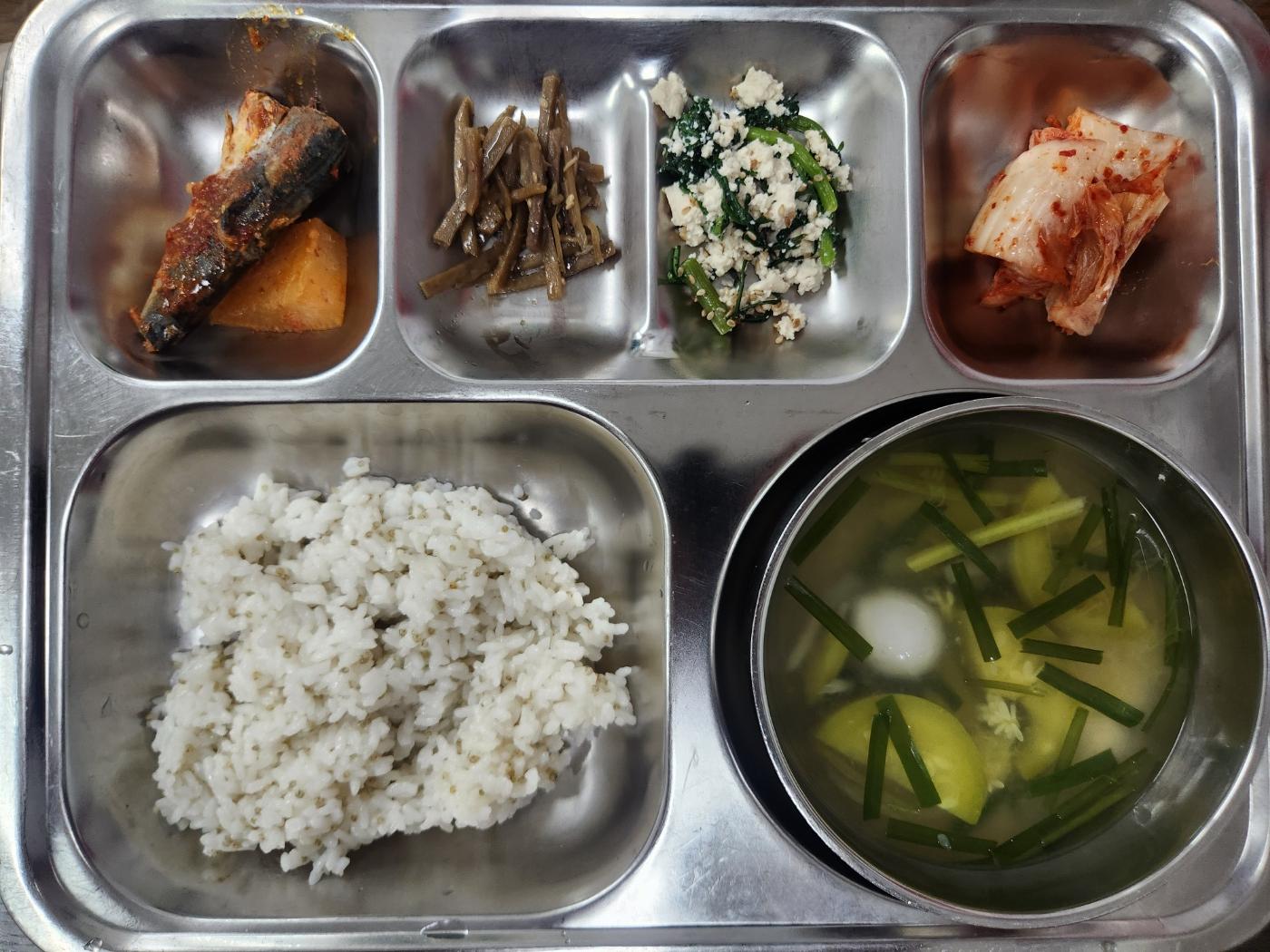 - 차조밥, 옹심이국, 고등어무조림, 두부쑥갓나물, 우엉조림, 배추김치
