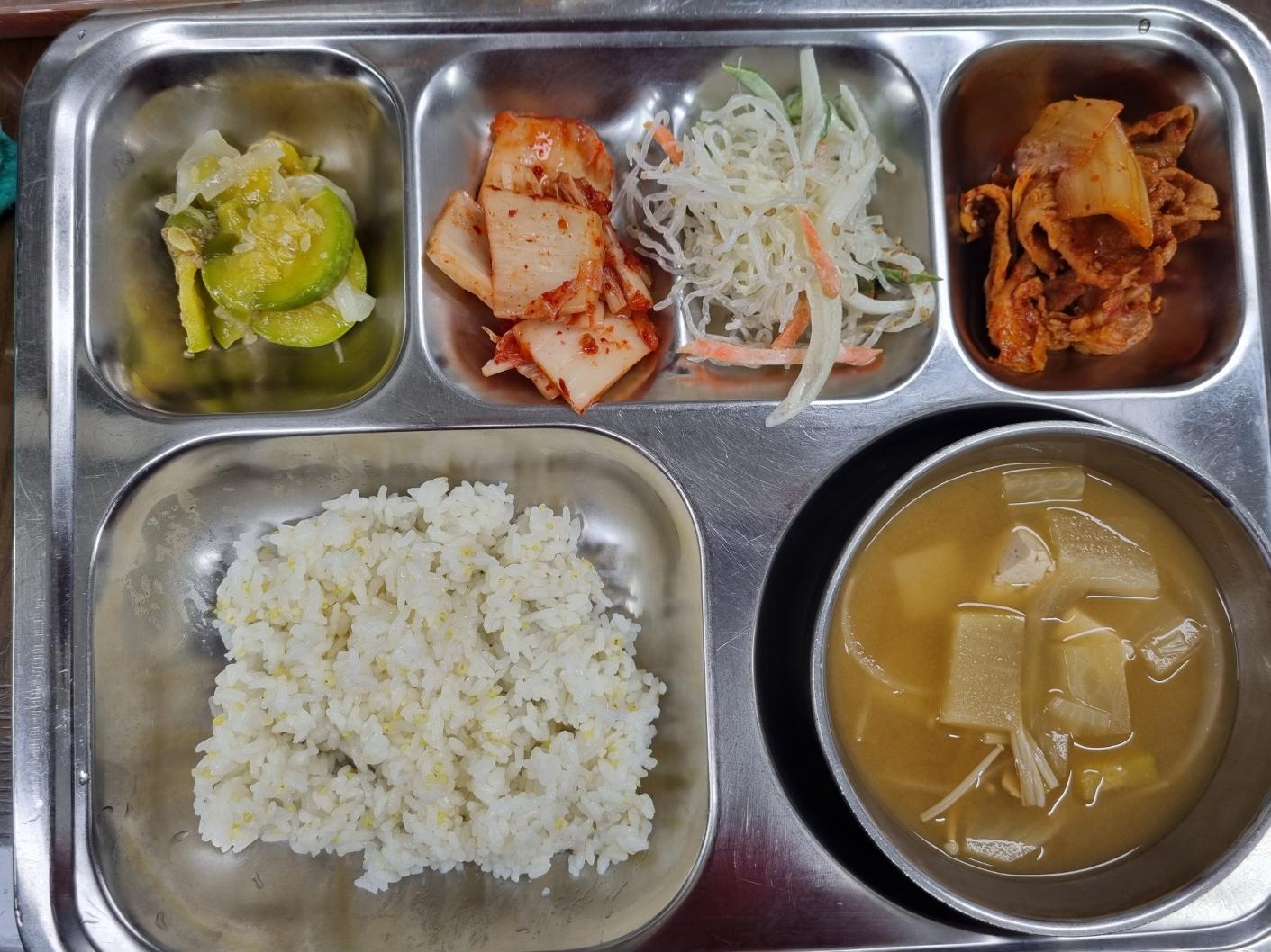 - 기장밥, 팽이미소국, 김치제육볶음, 천사채샐러드, 호박볶음, 배추김치