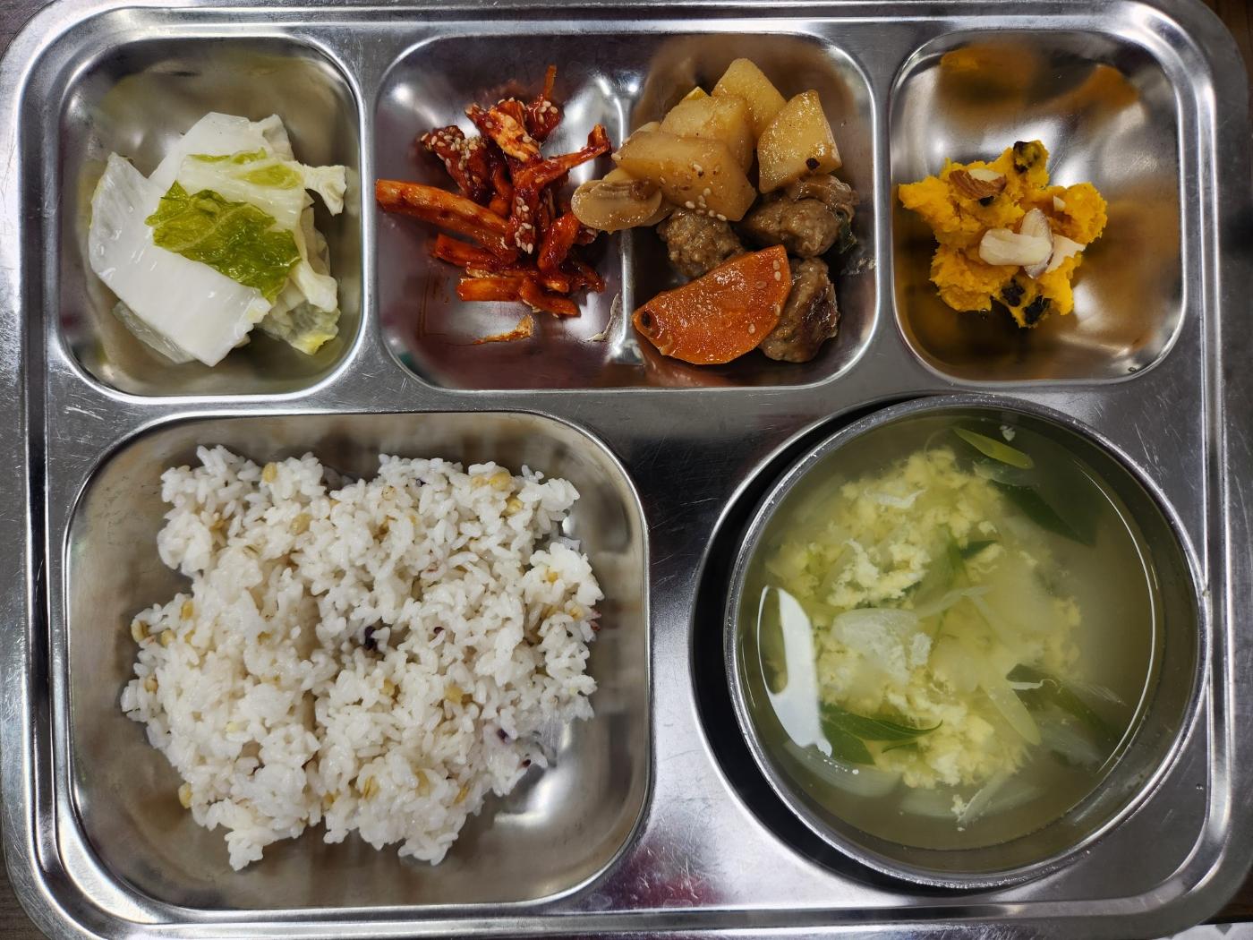 - 혼합잡곡, 실파계란국, 미트볼야채볶음, 단호박범벅, 무말랭이, 백김치