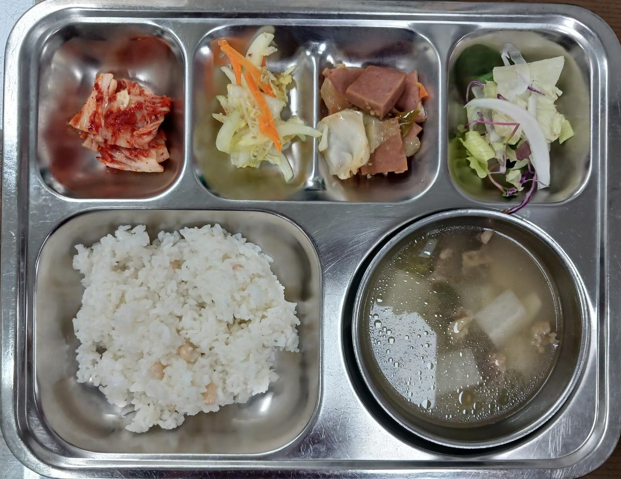 - 흰강낭콩밥, 소고기무국, 채소겨자무침, 행야채볶음, 이탈리안샐러드, 배추김치