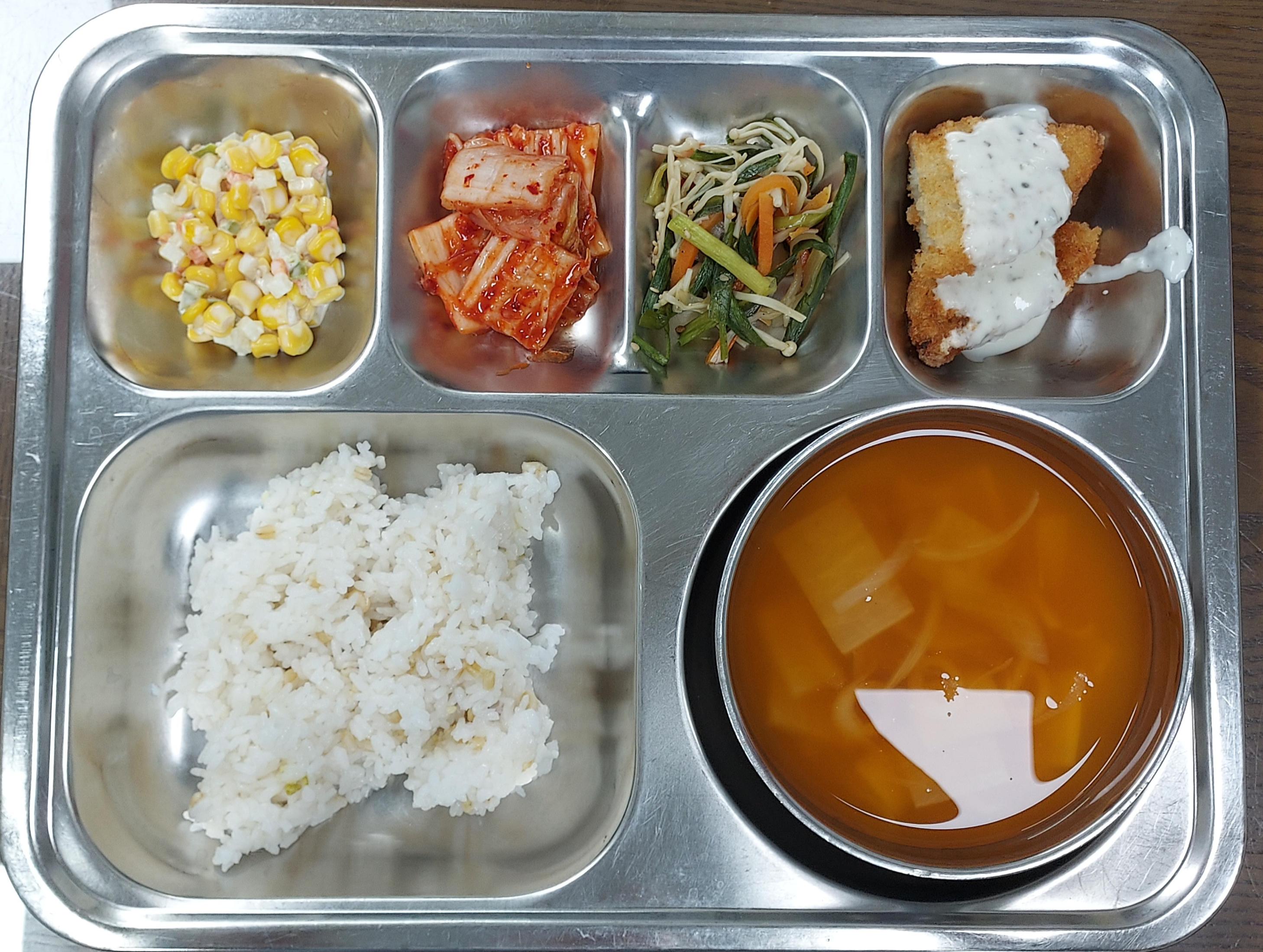 - 혼합잡곡밥, 매콤토란국, 생선까스/소스, 팽이버섯볶음, 콘슬로우, 배추김치