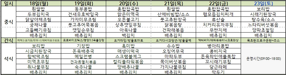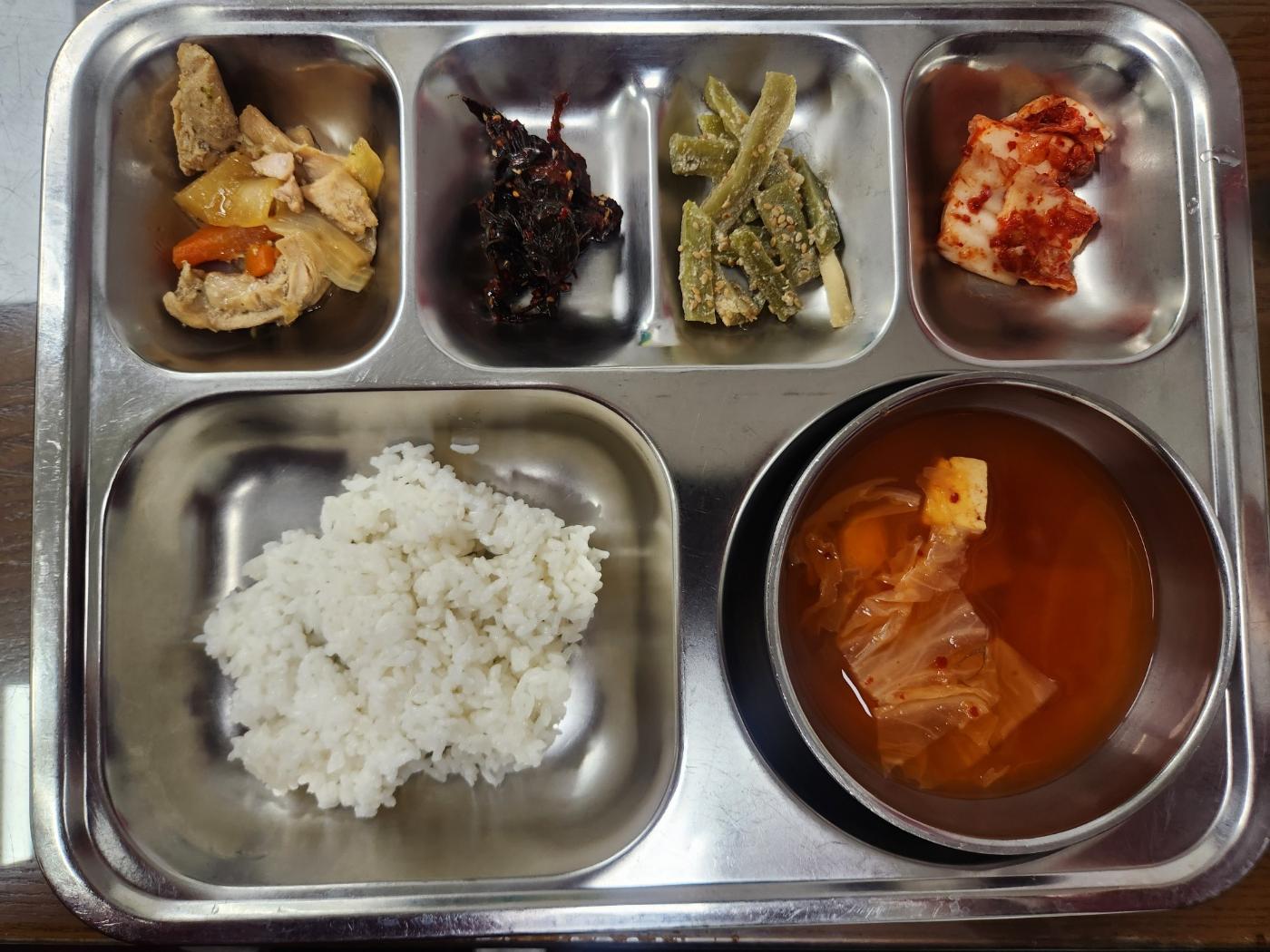 - 흰쌀밥, 두부김치국, 닭살야채조림, 궁채나물, 고들빼기무침, 배추김치