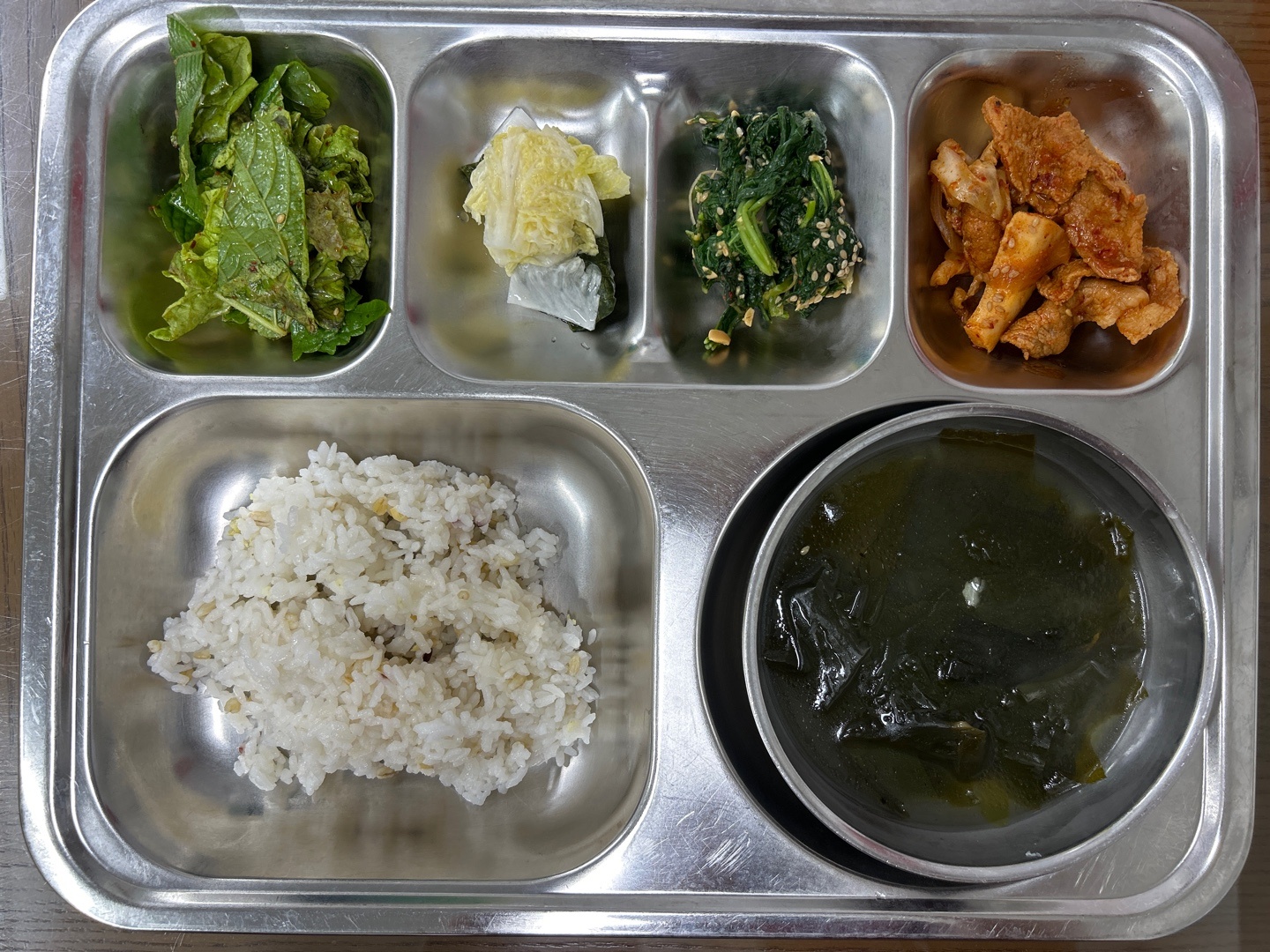 - 혼합잡곡밥, 맑은미역국, 오돈불고기, 상추깻잎무침, 아욱나물, 백김치