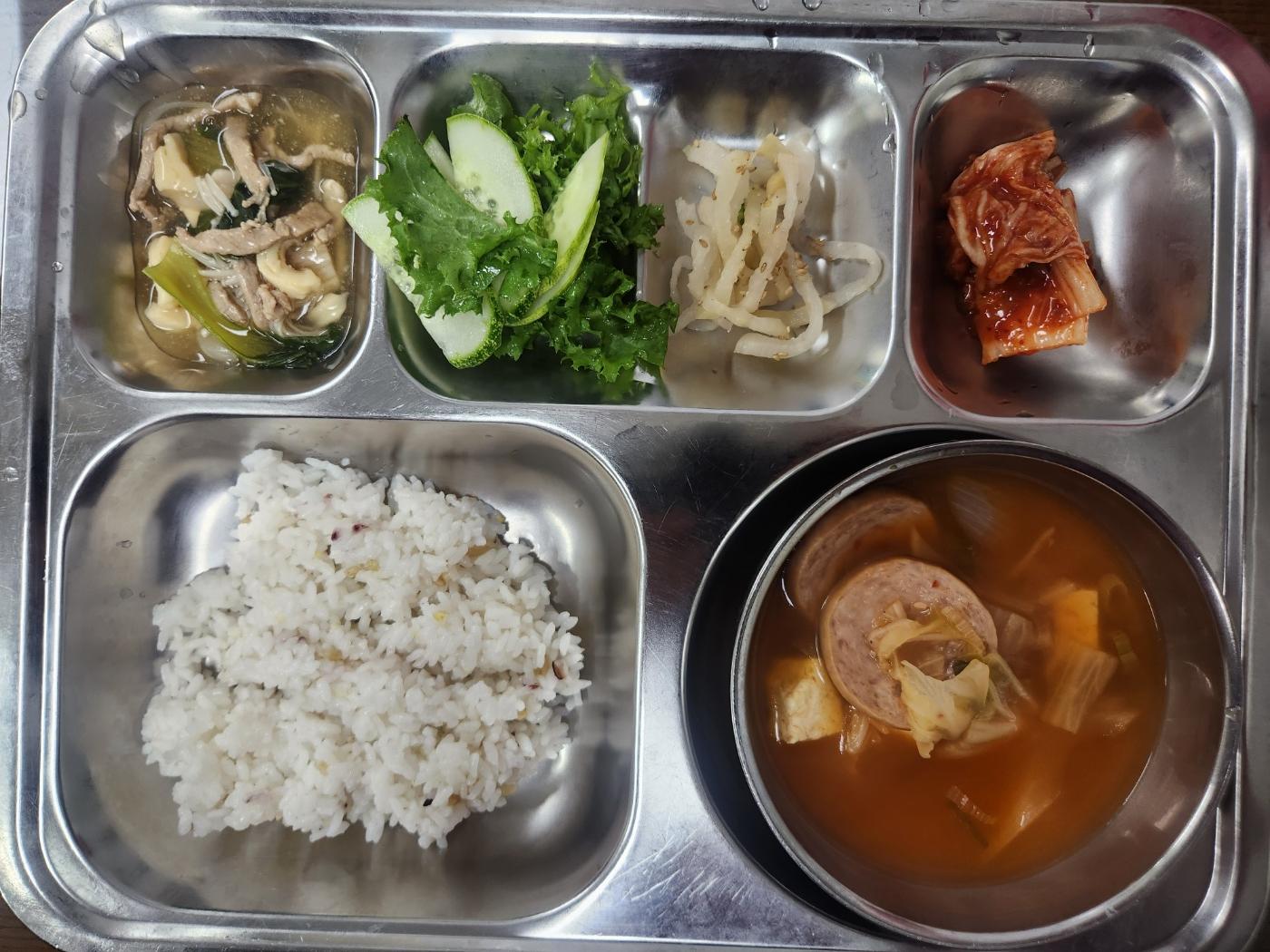 - 혼합잡곡밥, 햄모듬김치찌개, 류산슬, 치커리유자무침, 무짠지채, 배추김치