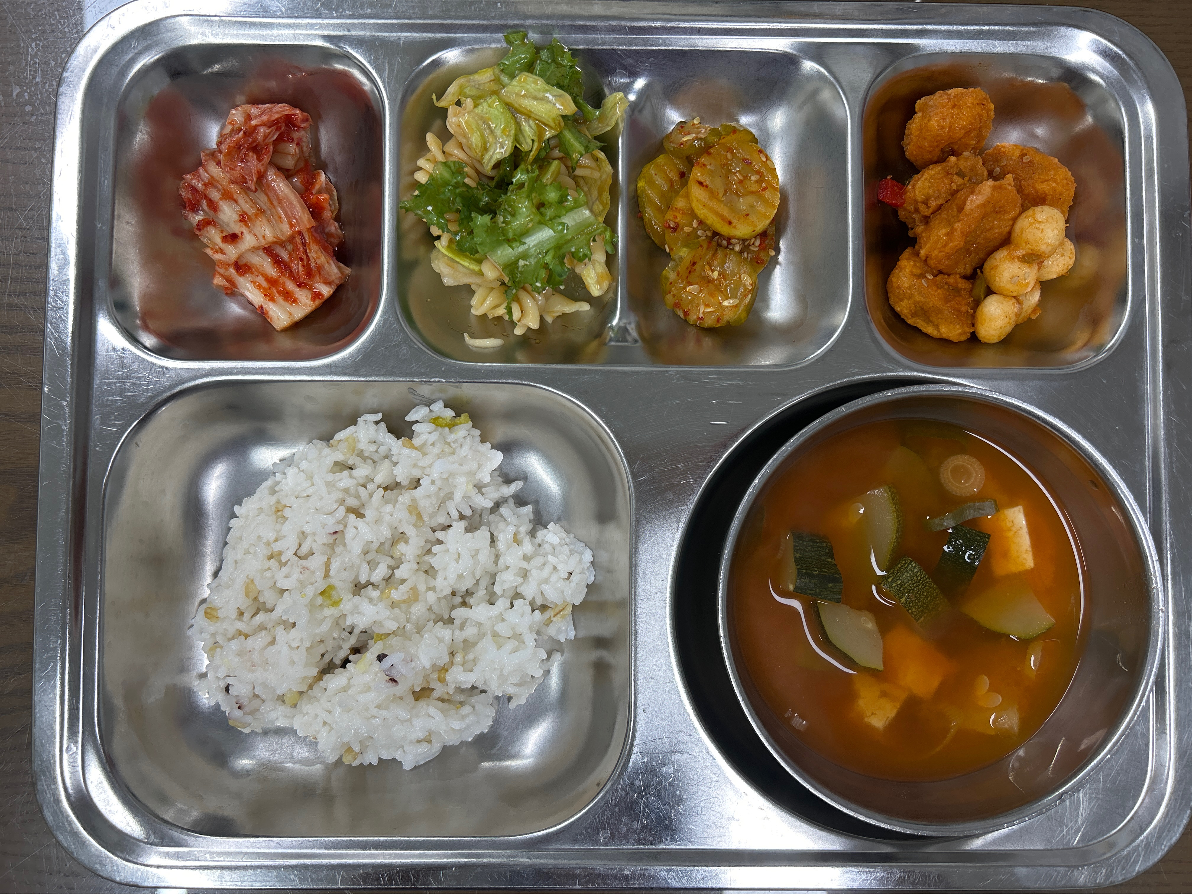 - 혼합잡곡밥, 감자고추장국, 닭가슴살깐풍기, 오이지무침, 푸실리샐러드, 배추김치