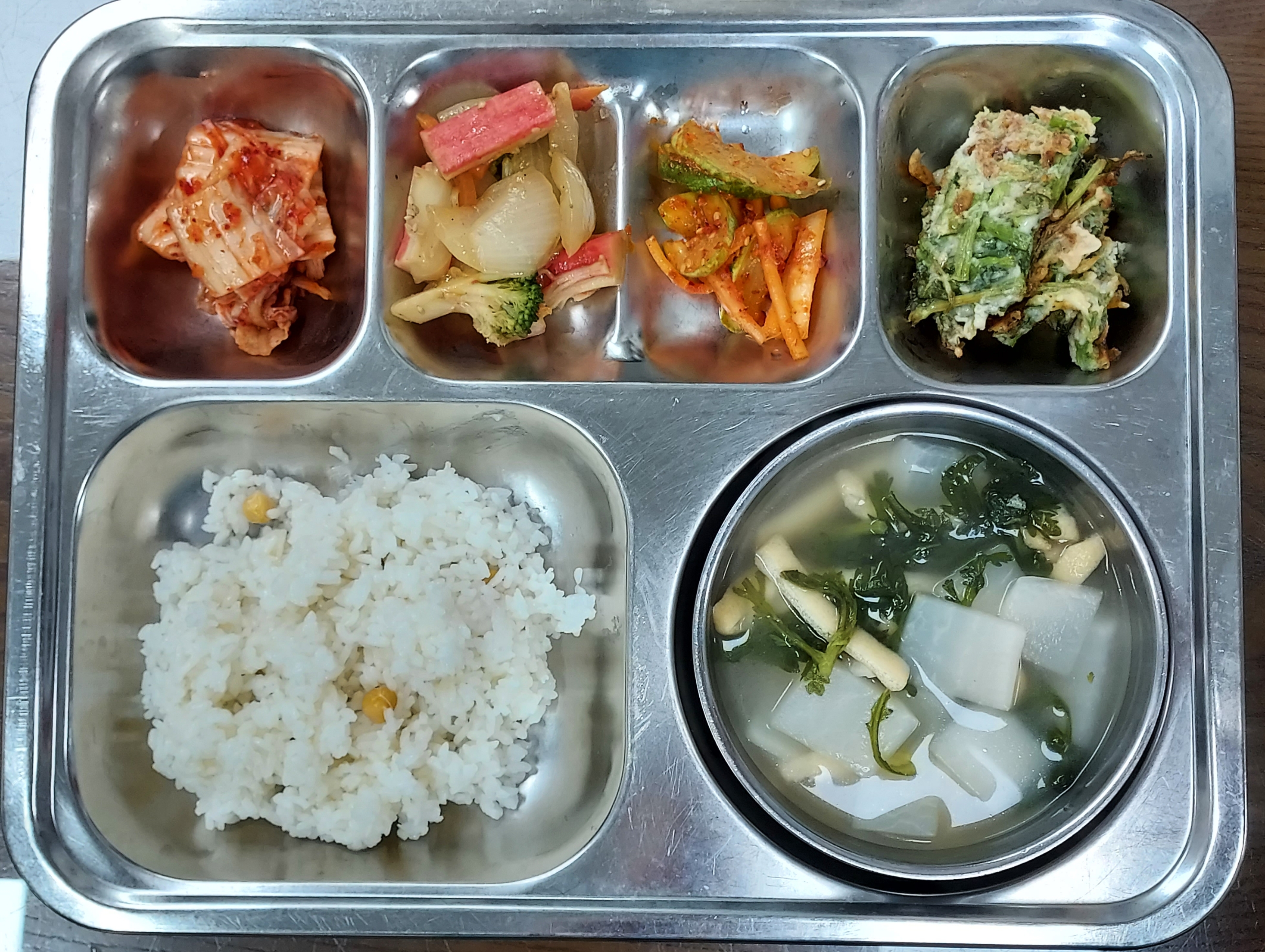 - 병아리콩밥, 유부쑥갓맑은국, 보리새우미나리전, 맛살채소볶음, 도라지생채, 배추김치