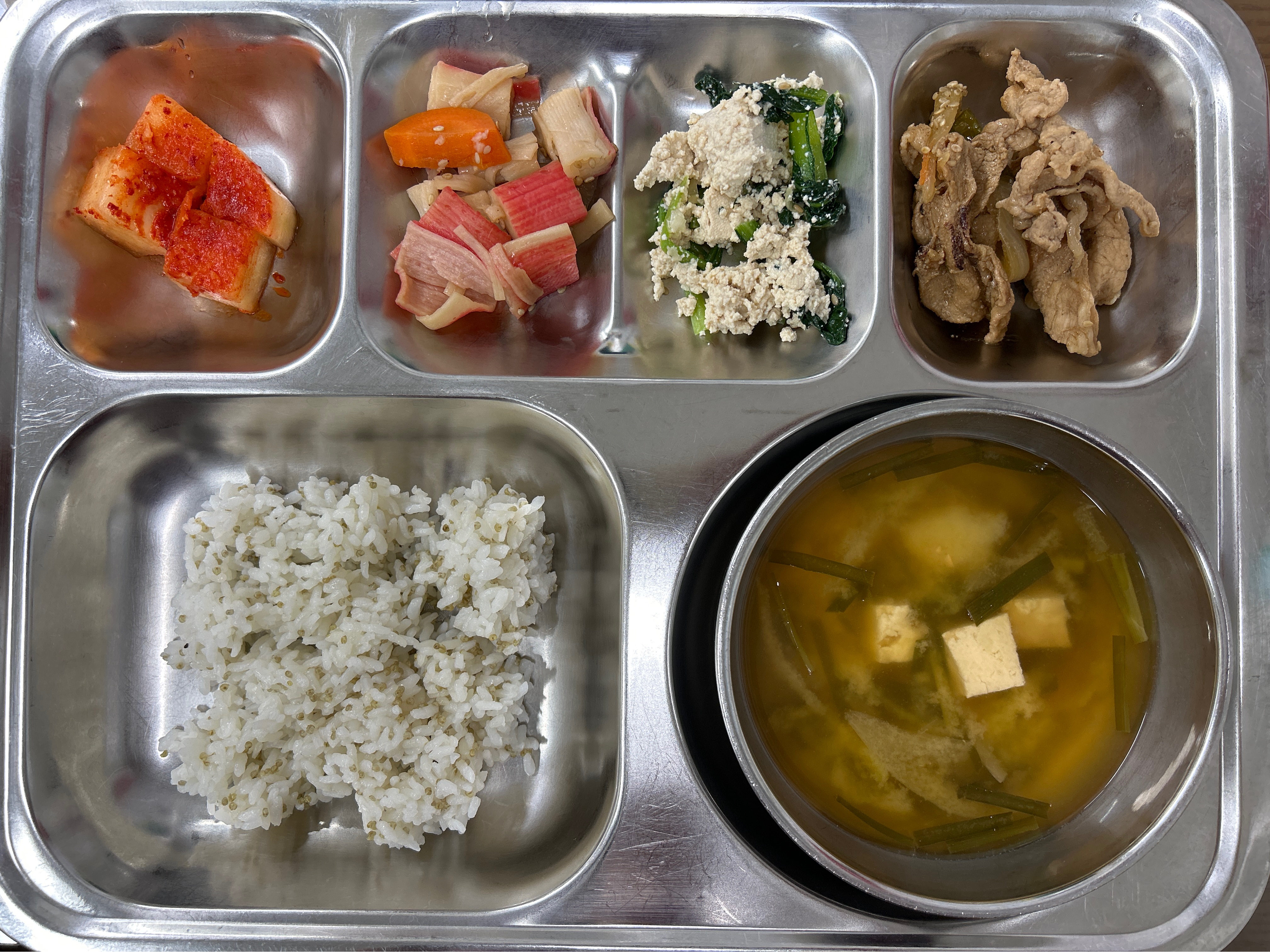 - 차조밥, 부추된장국, 돈육야채볶음, 맛살곤약조림, 비타민두부무침, 깍두기