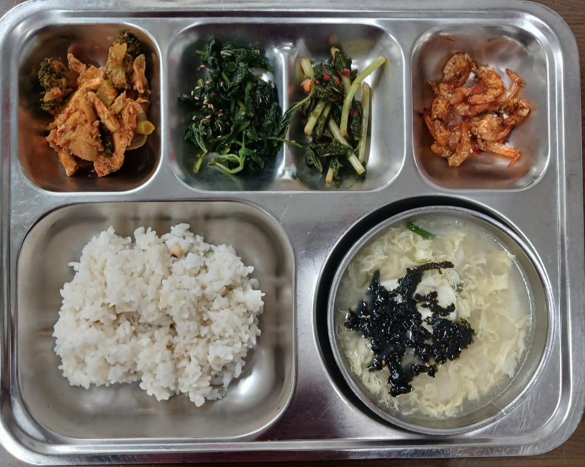 - 동부콩밥, 김가루떡국, 닭살고추장볶음, 건새우볶음, 바라깻잎나물, 열무김치