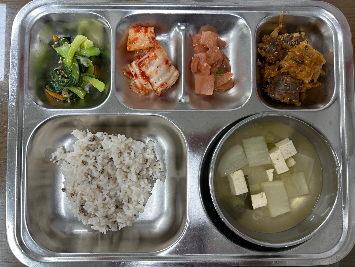 - 흑보리밥, 두부다시마무국, 순대채소볶음, 조갯살청경채볶음, 오복지무침, 배추김치