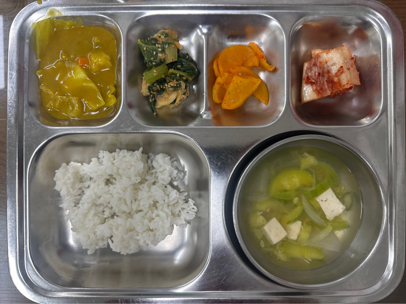 - 흰쌀밥,양파호박국,소고기카레덮밥,단배추나물,매콤단무지무침,배추김치
