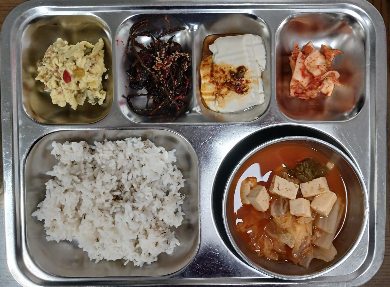 - 보리밥, 얼큰김칫국, 스크램블에그, 고추잎나물무침, 연두부/양념장, 배추김치
