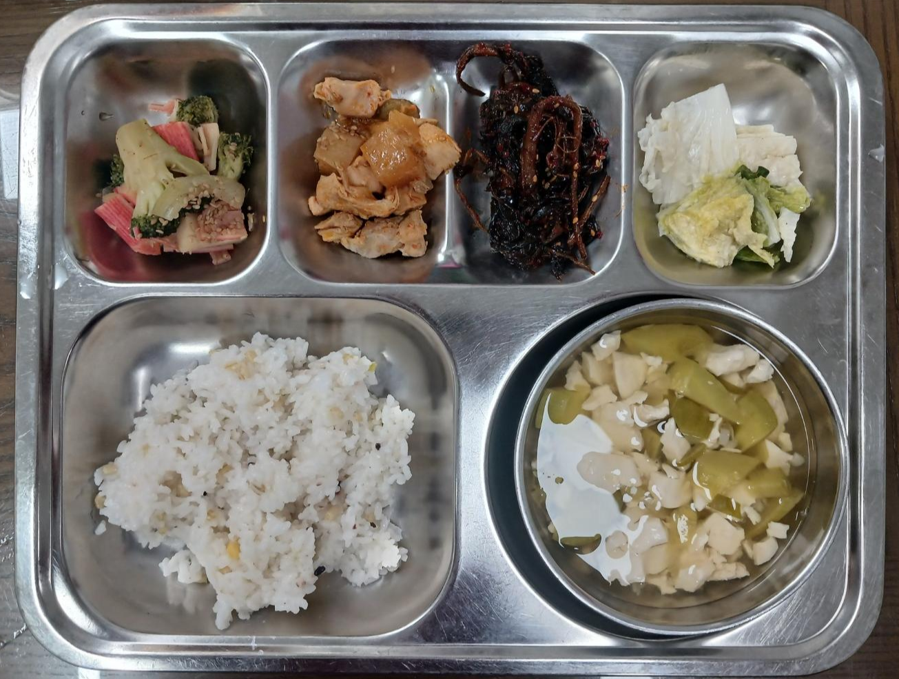 - 혼합잡곡밥, 맑은순두부국, 닭고기간장무조림, 맛살채소볶음, 고들빼기, 백김치