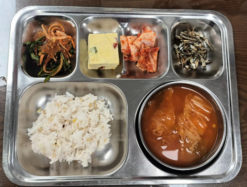 - 혼합잡곡밥, 스팸김치국, 삼색계란찜, 견과류멸치볶음, 우무채소무침, 배추김치