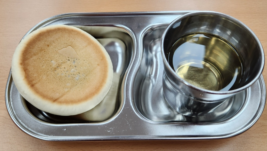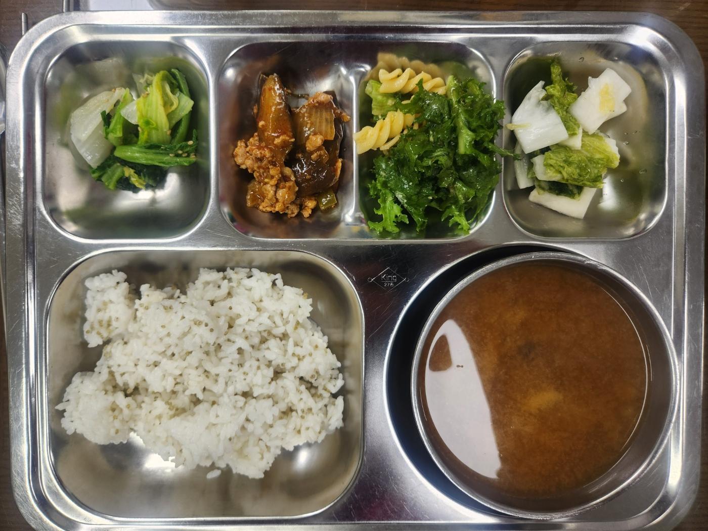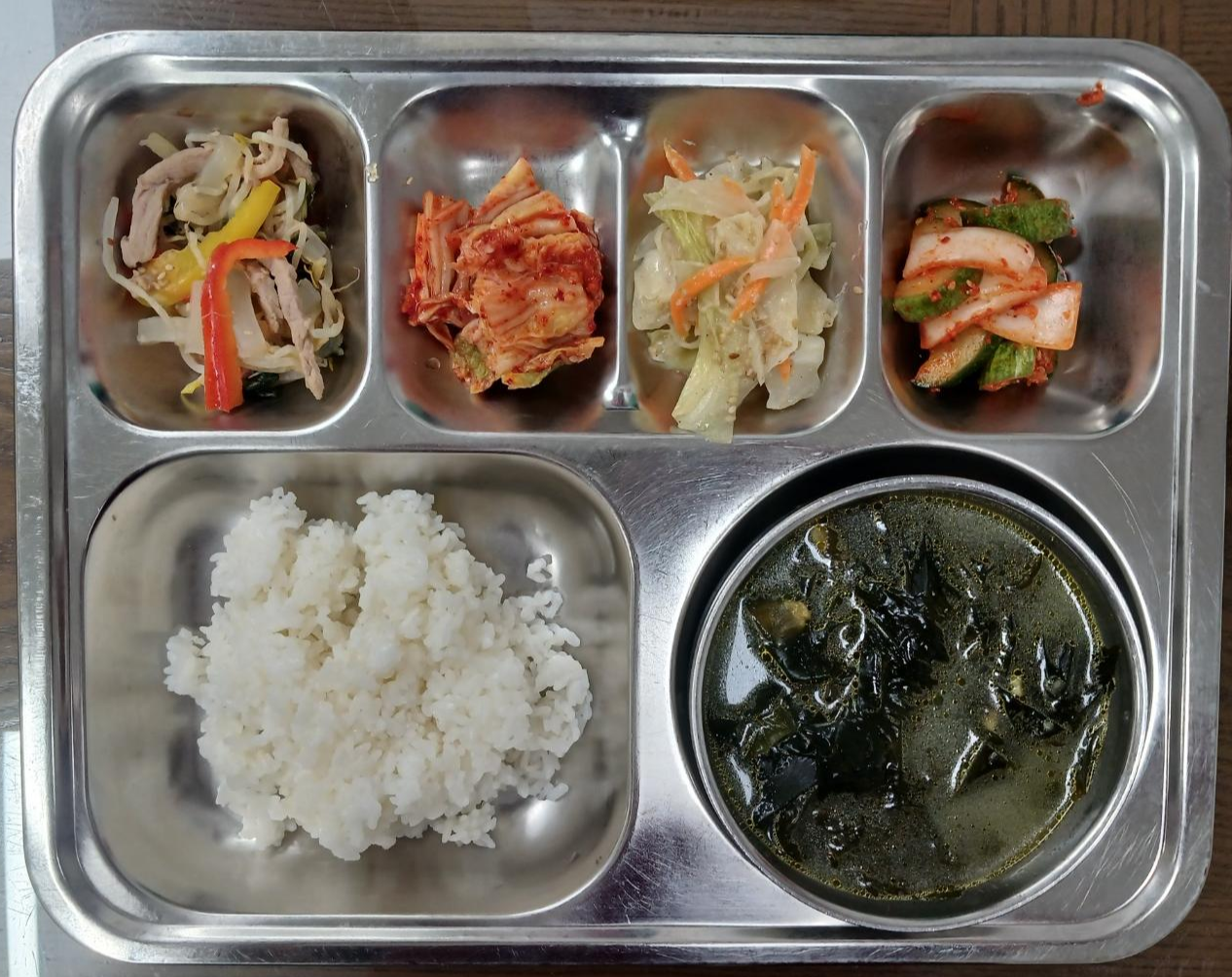 - 흰쌀밥, 조개살미역국, 돈육탕평채, 오이양파무침, 양배추나물, 배추김치