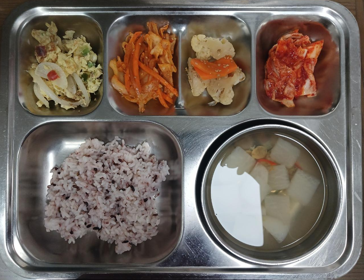 - 흑미밥,바지락무국,스크램블에그,컬리플라워볶음,양배추나물,배추김치
