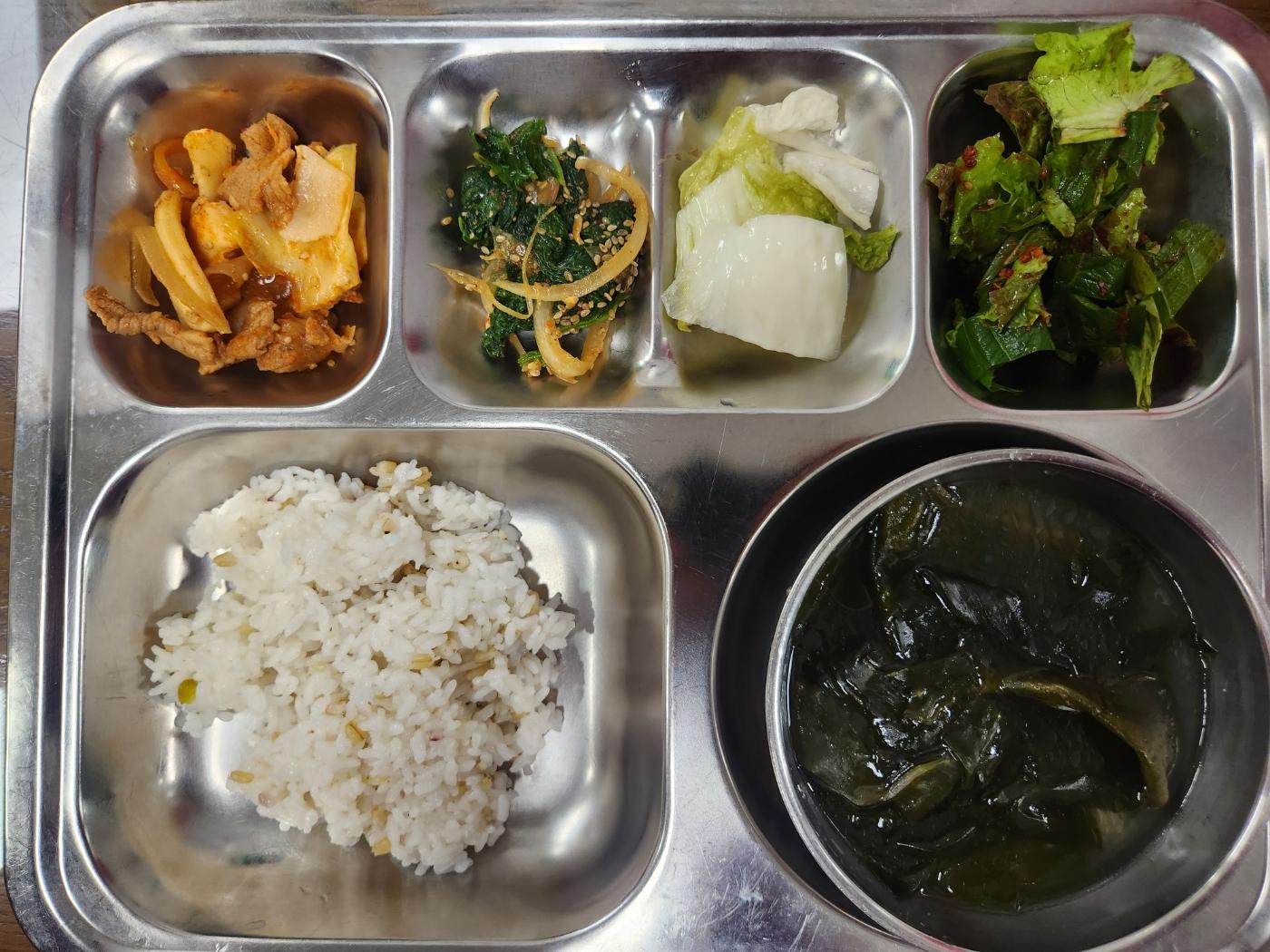 - 혼합잡곡밥,맑은미역국,오돈불고기,상추깻잎무침,아욱나물,백김치