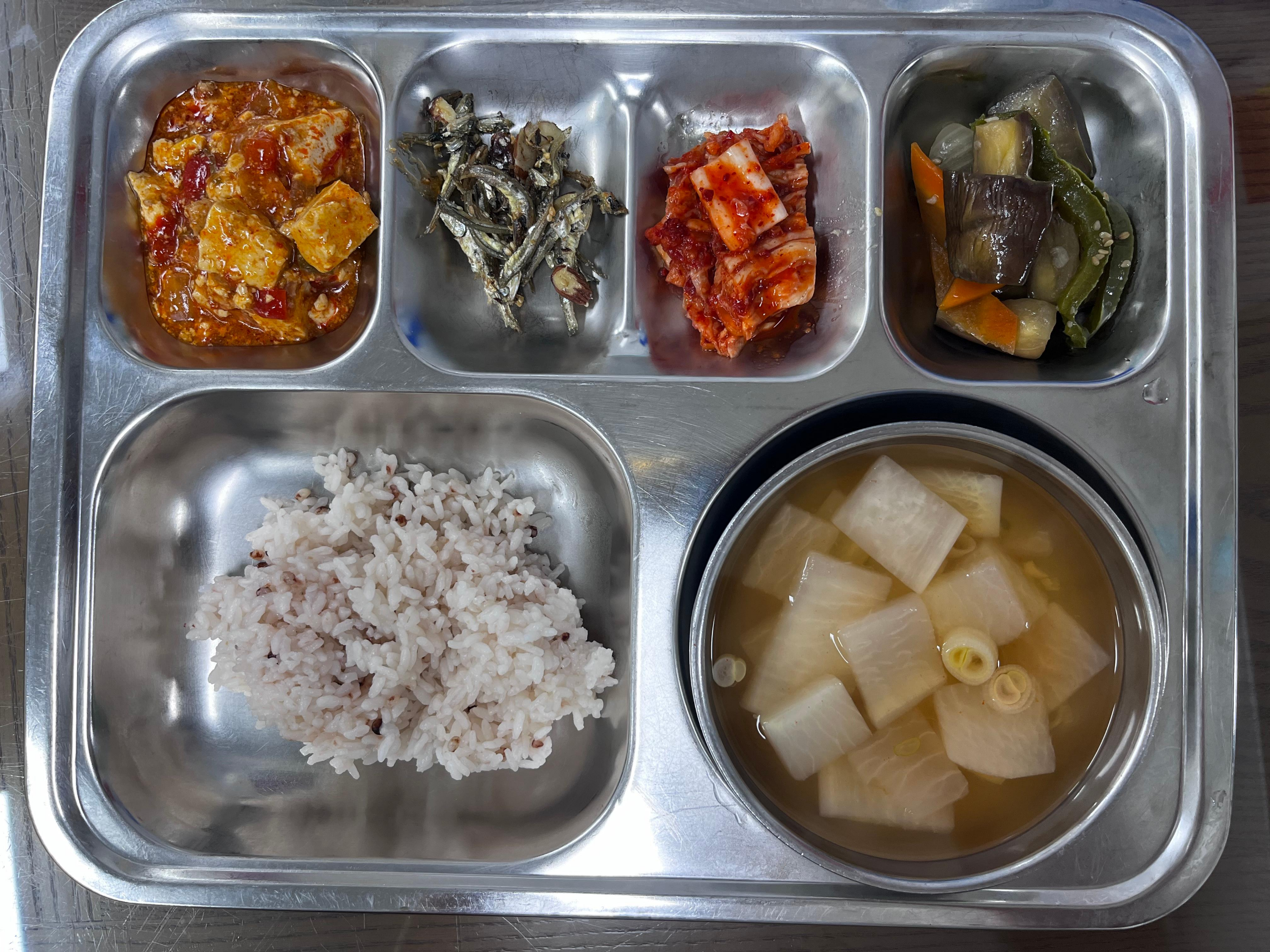 - 수수밥, 오징어무국, 마파두부, 견과류멸치볶음, 가지나물무침, 배추김치
