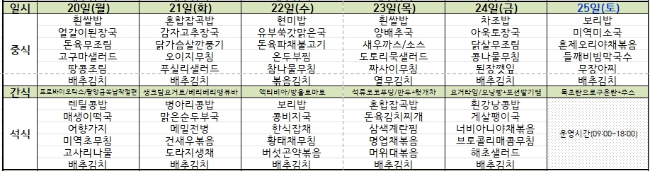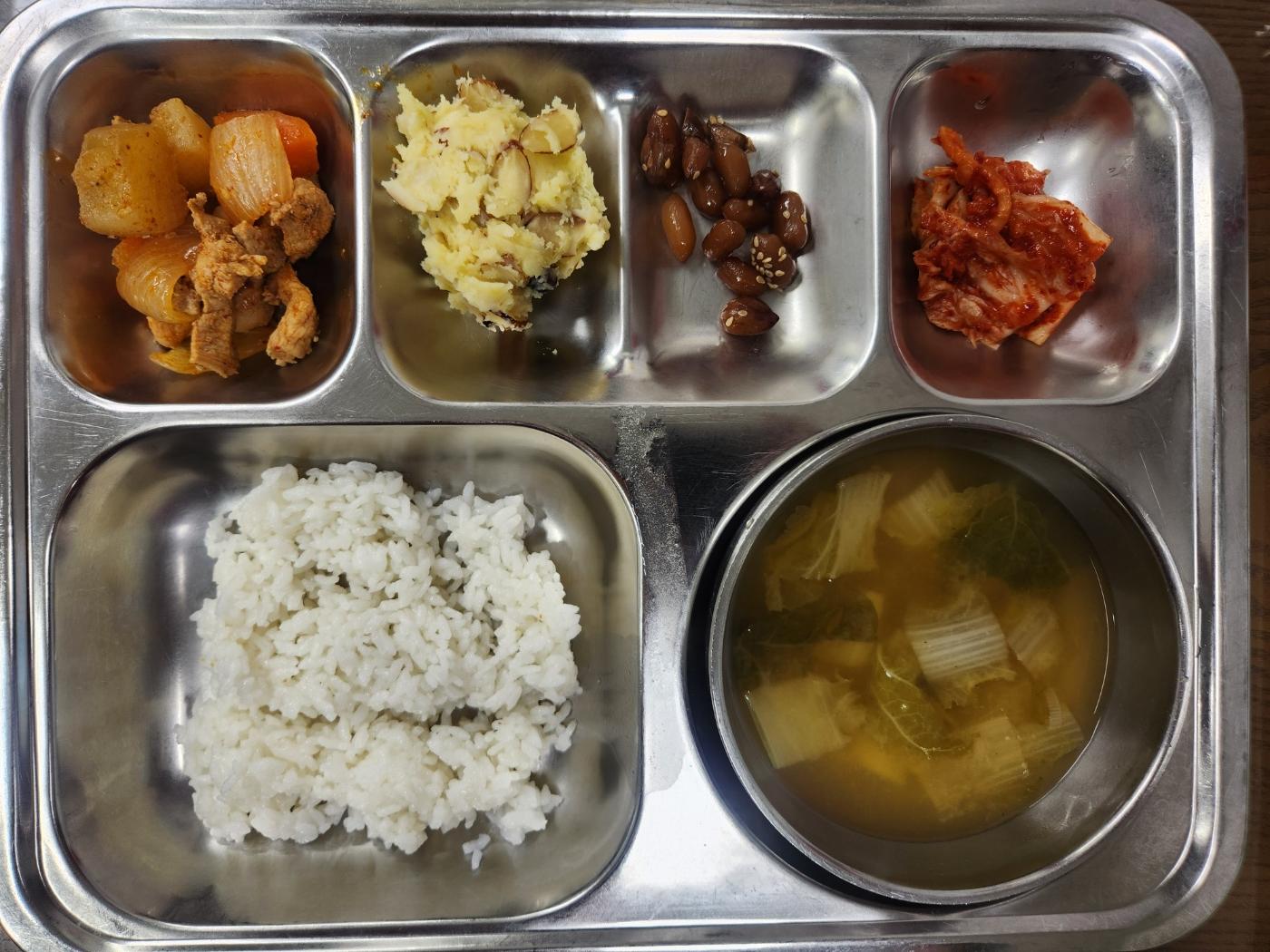 - 흰쌀밥,얼갈이된장국,돈육무조림,고구마샐러드,땅콩조림,배추김치