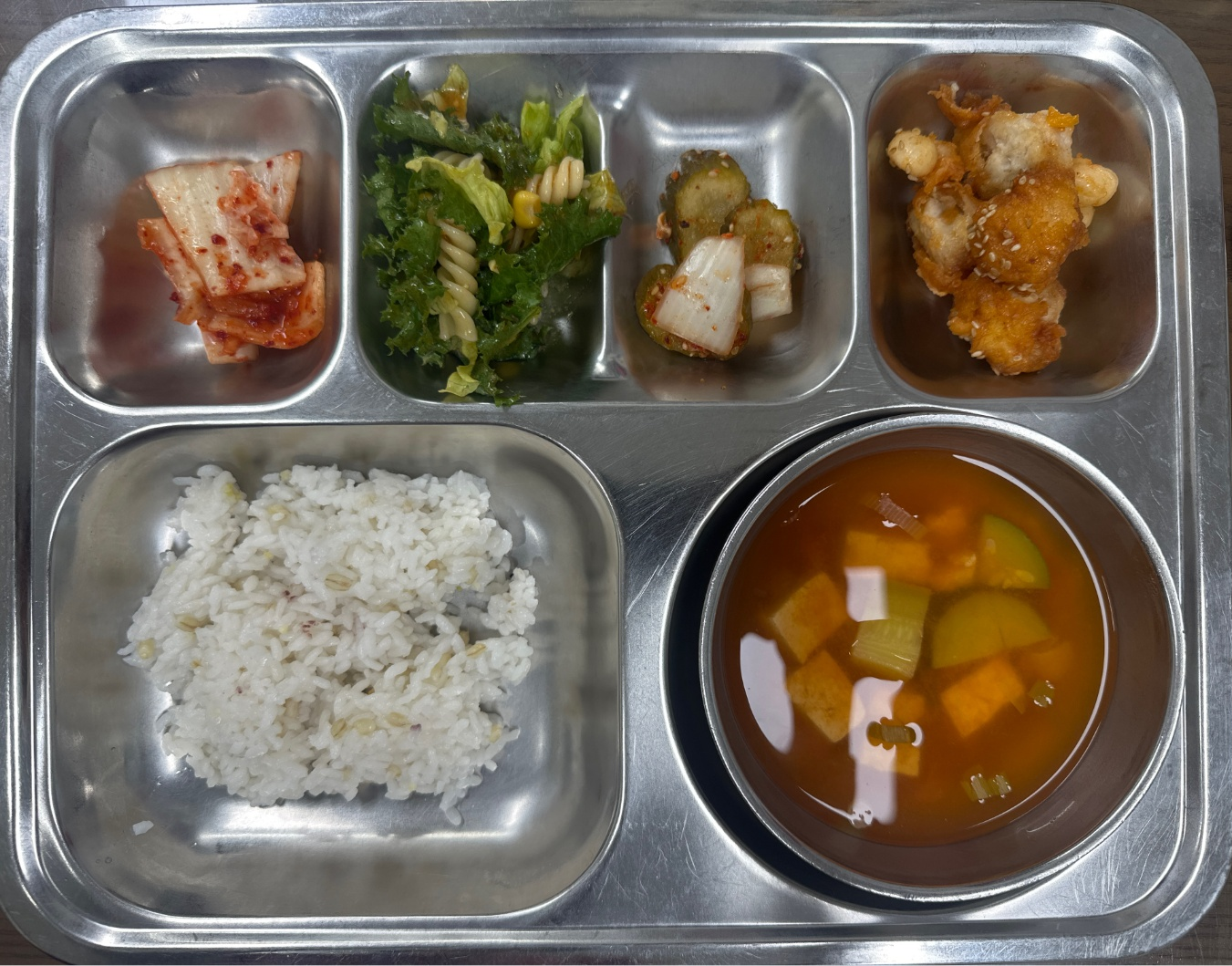 - 혼합잡곡밥,감자고추장국,닭가슴살깐풍기,오이지무침,푸실리샐러드,배추김치