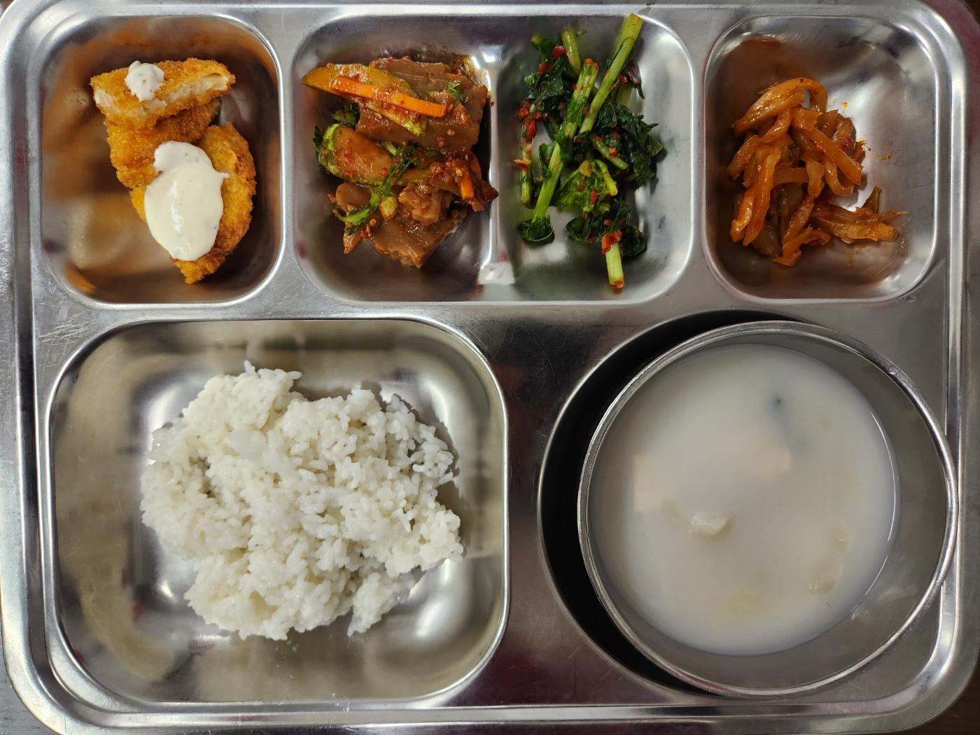 - 흰쌀밥, 양배추국, 새우까스/소스, 도토리묵샐러드, 짜사이무침, 열무김치