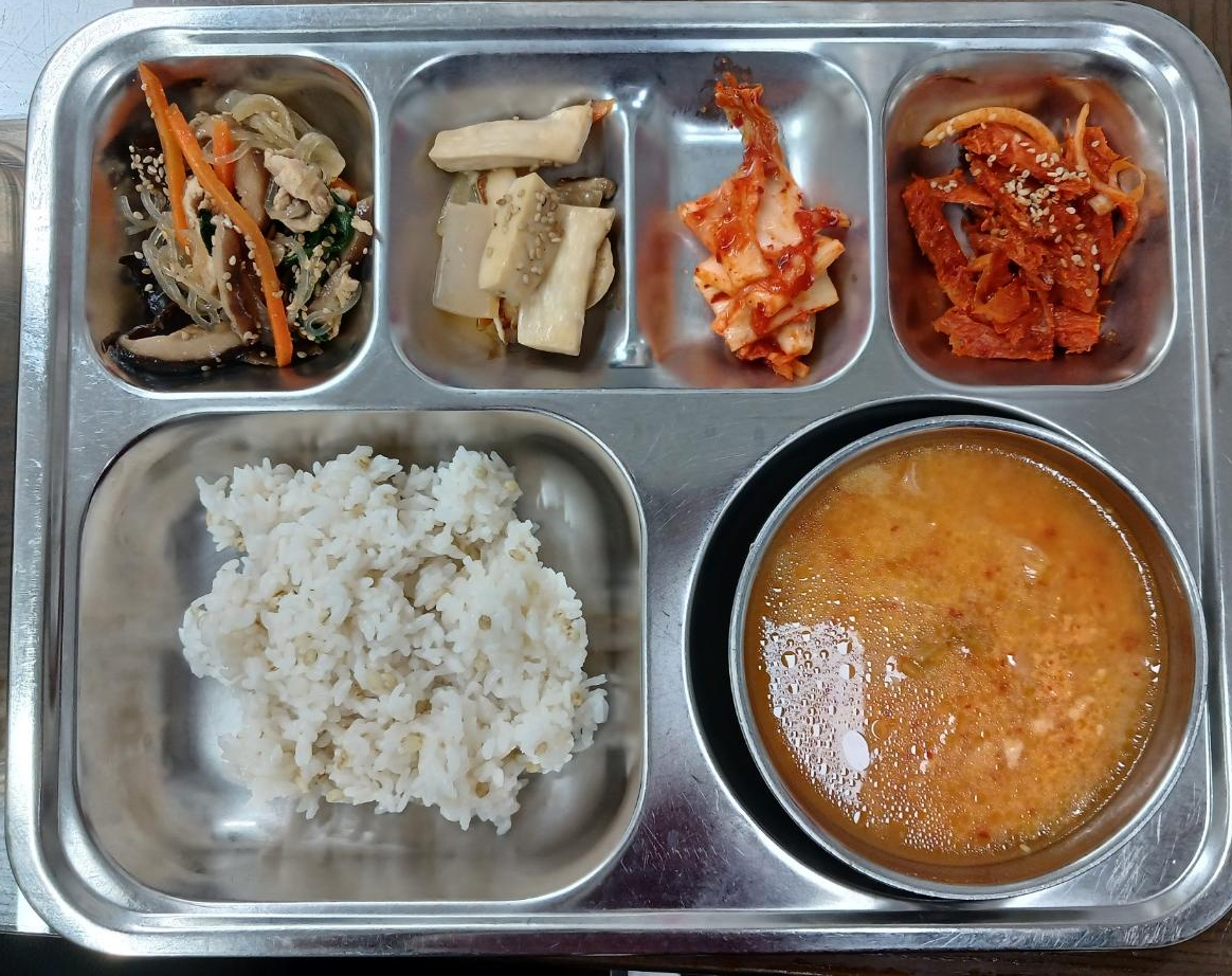 - 혼합잡곡밥, 돈육김치찌개, 삼색계란찜, 명엽채볶음, 머위대볶음, 배추김치