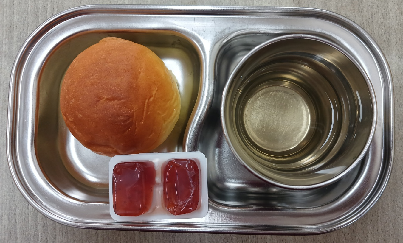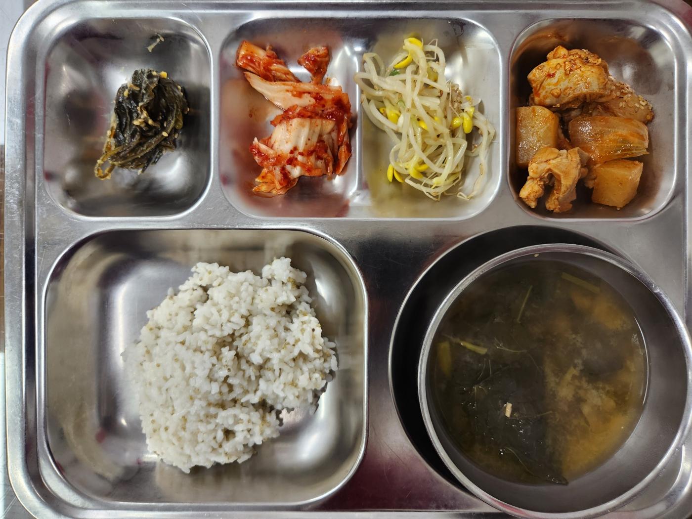 - 흰강낭콩밥, 게살팽이국, 너비아니야채볶음, 브로콜리매콤무침, 해초샐러드, 배추김치