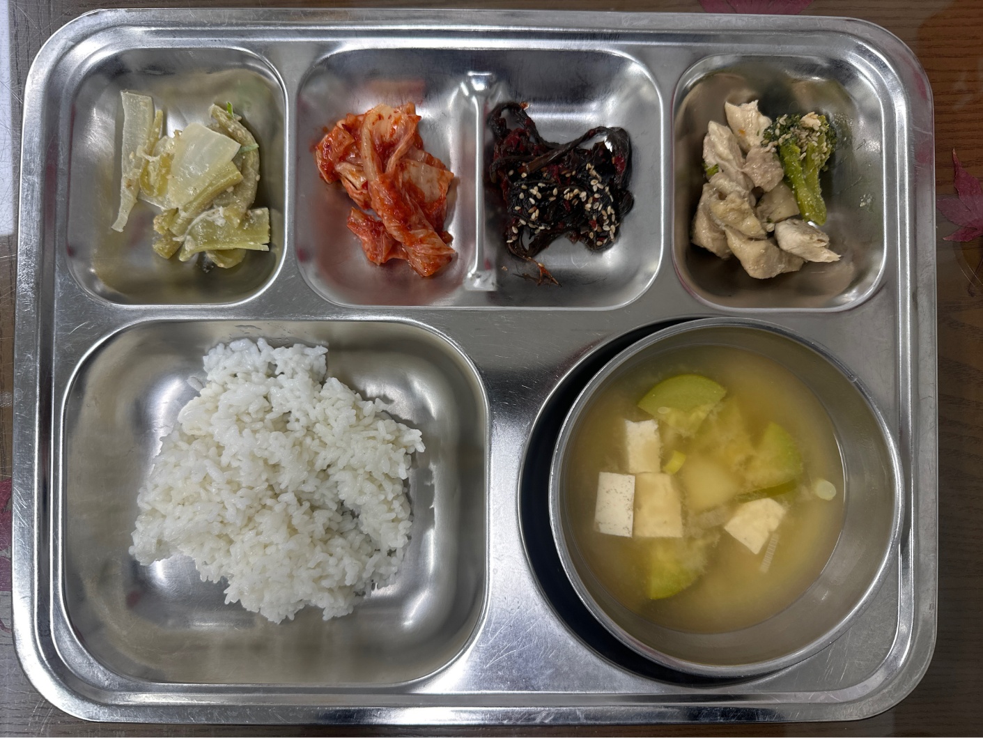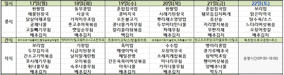 - 흰쌀밥, 해물된장국, 닭살야채조림, 궁채나물, 고들빼기무침, 배추김치