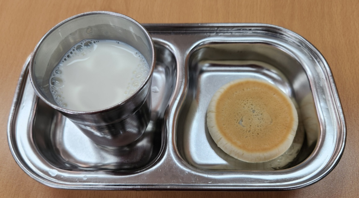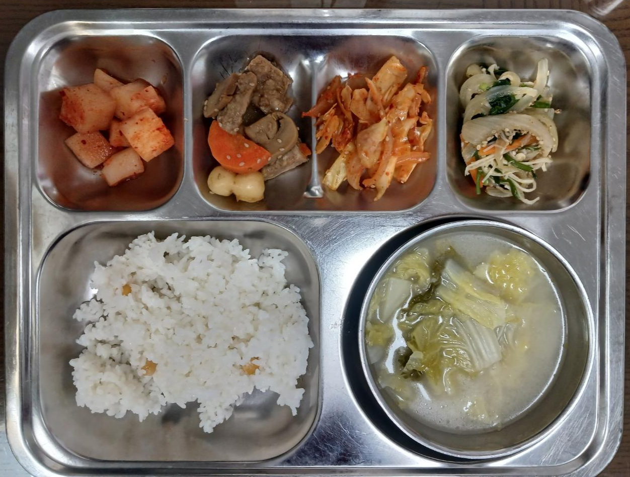 - 병아리콩밥, 콩가루배추국, 함박떡조림, 팽이버섯볶음, 양배추나물, 깍두기