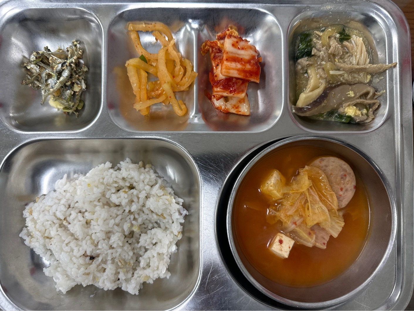- 혼합잡곡밥, 햄모듬김치찌개, 류산슬, 지리멸치볶음, 무짠지채, 배추김치