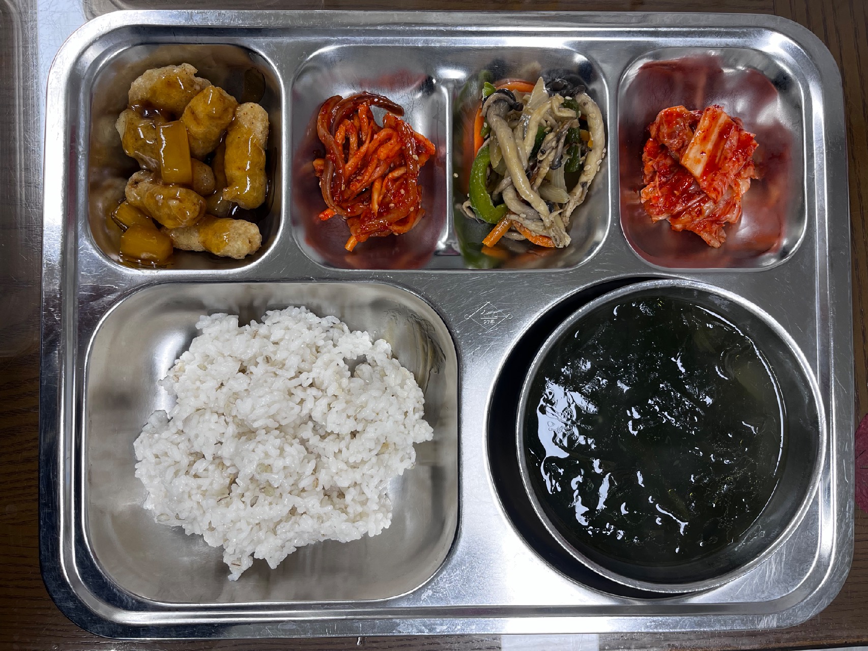 - 보리밥, 맑은미역국, 탕수육/소스, 느타리버섯볶음, 오징어젓갈, 배추김치