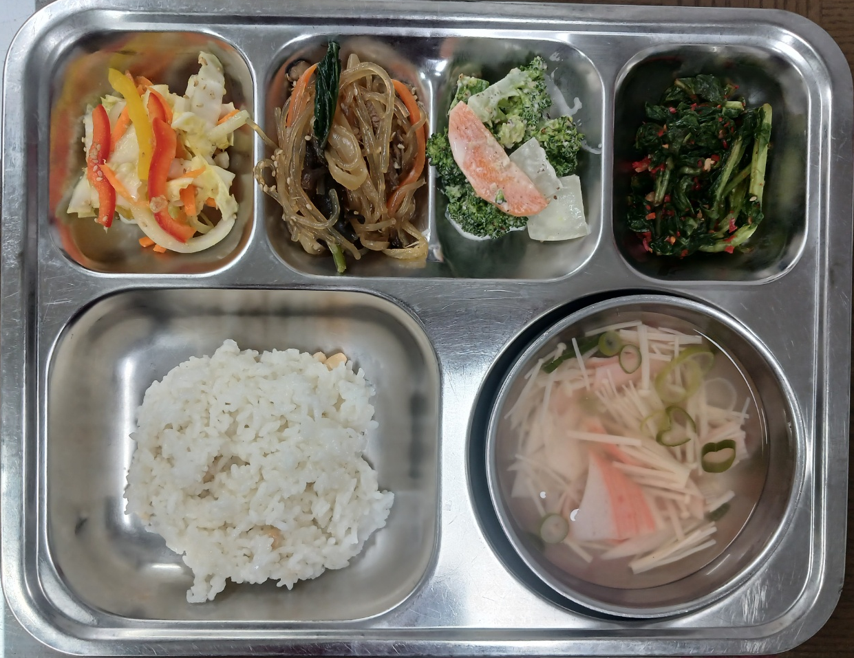- 흰강낭콩밥,게살팽이국,소고기잡채,브로콜리들깨무침,배추겨자초무침,열무김치