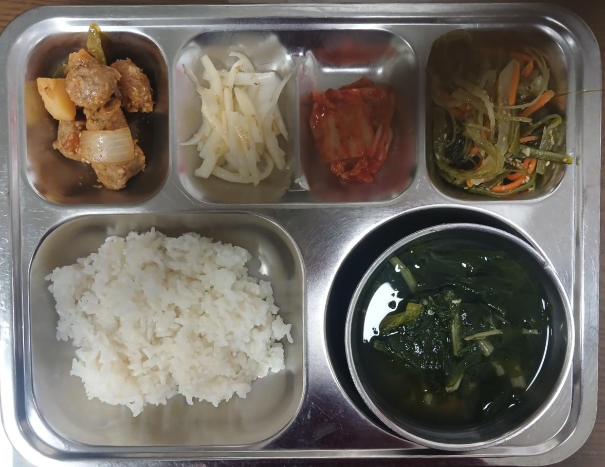 - 흰쌀밥,무청국,미트볼조림,미역줄기볶음,도라지나물,배추김치