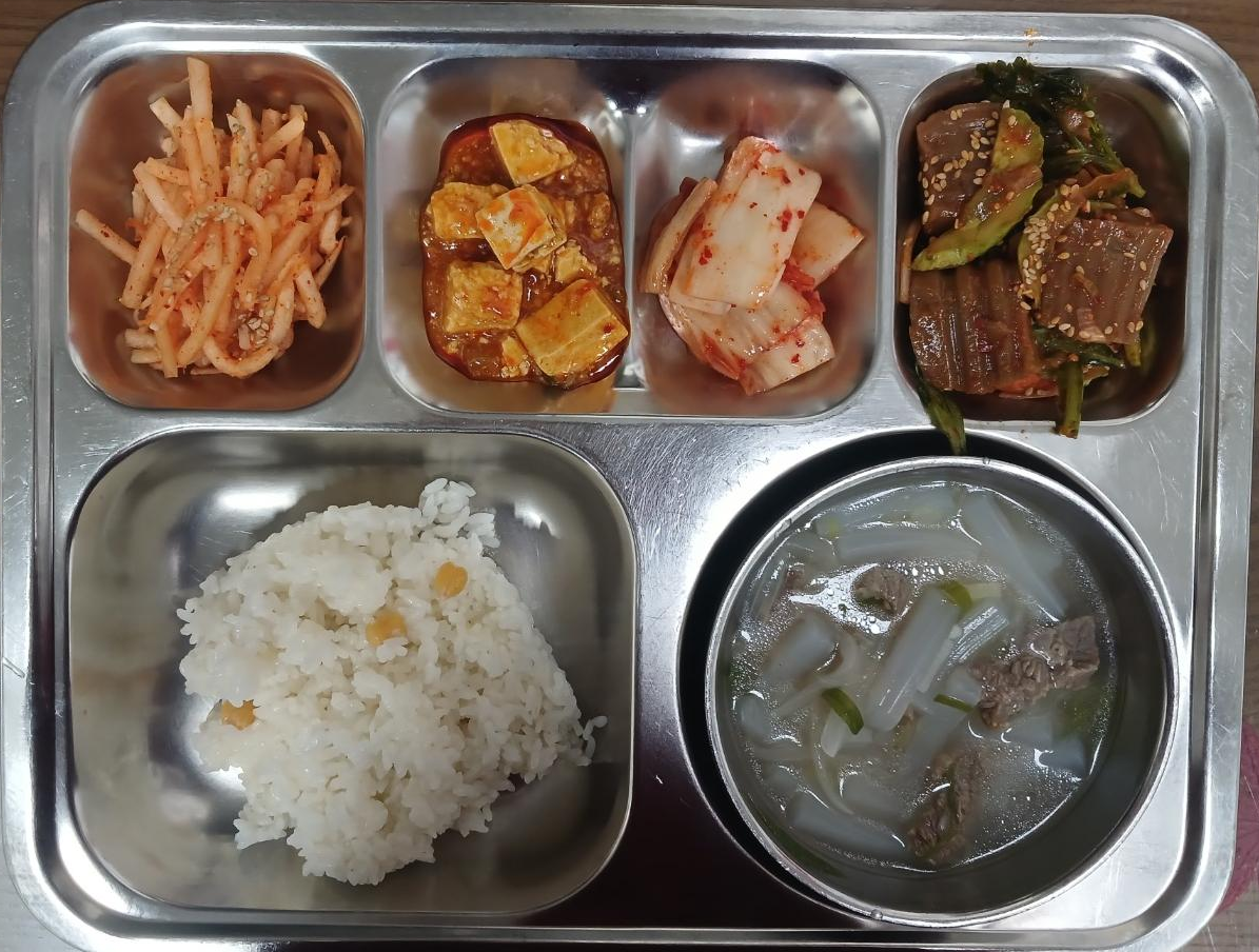 - 보리밥, 들깨미역국, 토마토닭볶음, 얼갈이된장무침, 양송이무침, 배추김치