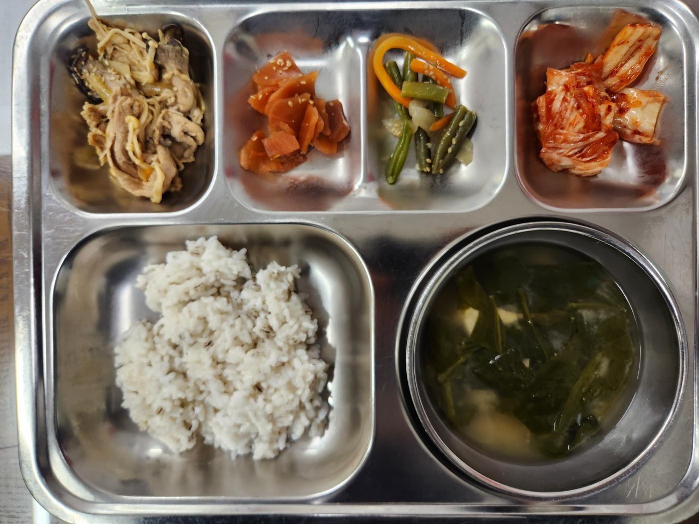 - 흑보리밥, 시금치토장국, 돈육야채볶음, 그린빈볶음, 오복지무침, 배추김치