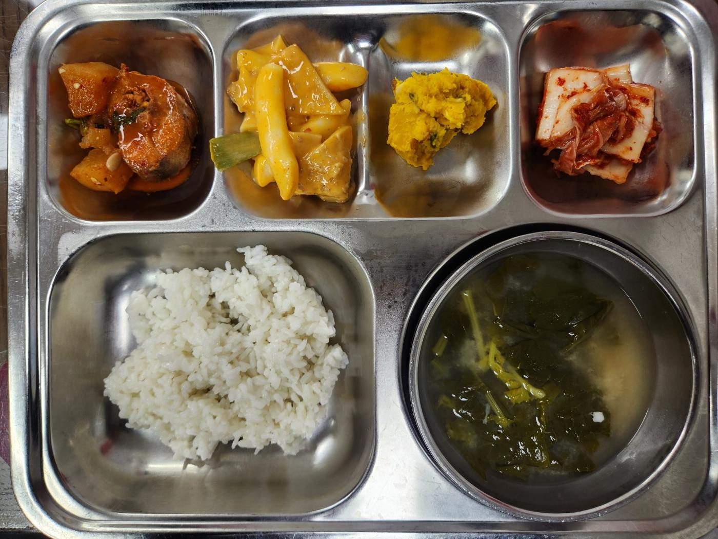 - 흰쌀밥, 열무된장국, 동태무조림, 로제떡볶이, 단호박샐러드, 배추김치