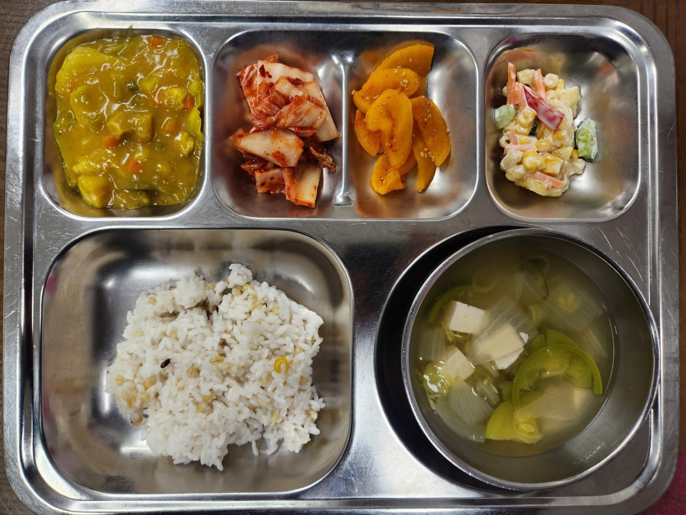 - 혼합잡곡밥, 양파호박국, 카레덮밥, 마카로니콘무침, 단무지무침, 배추김치