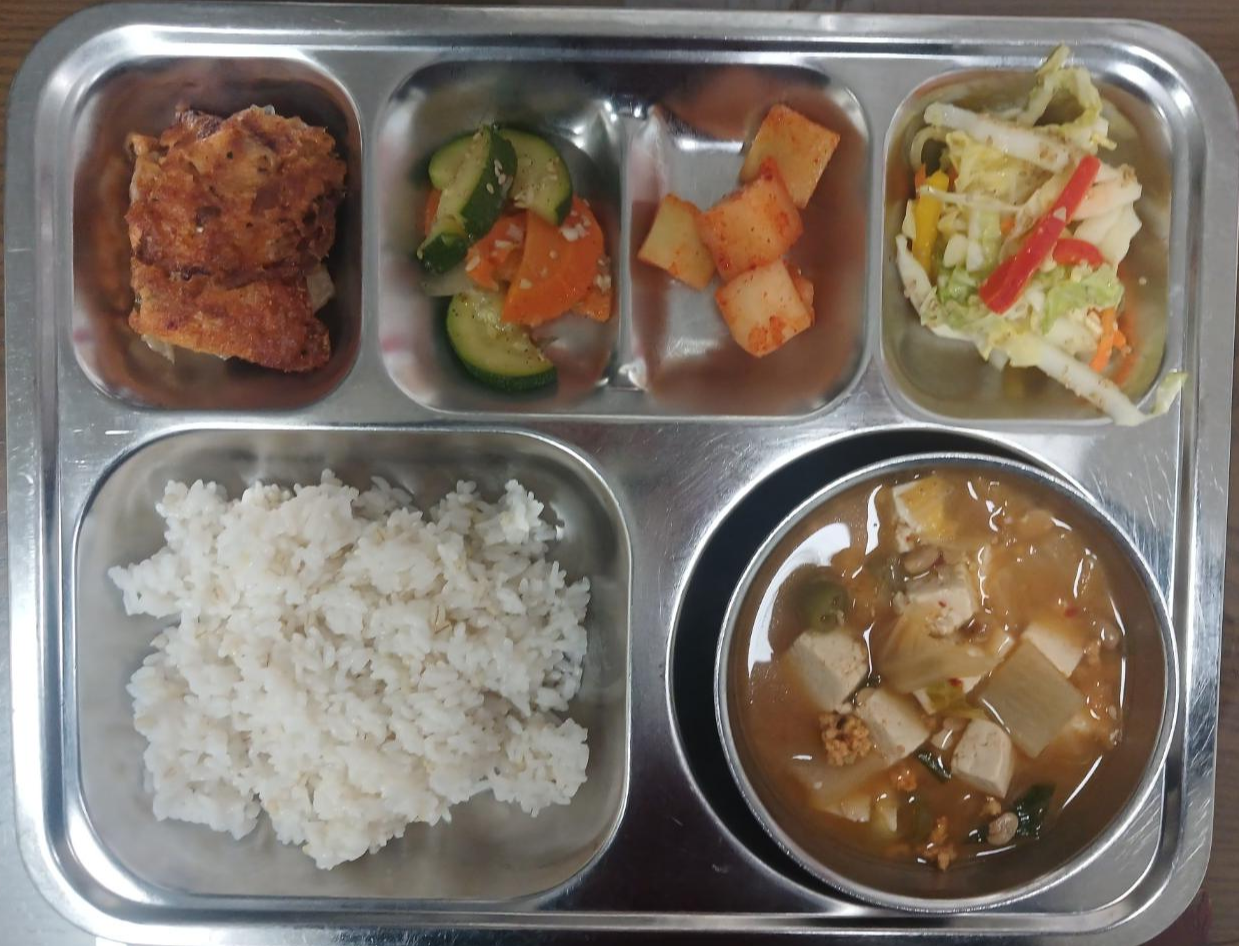 - 보리밥,청국장,참치김치전,쥬키니호박볶음,배추겨자무침,깍두기