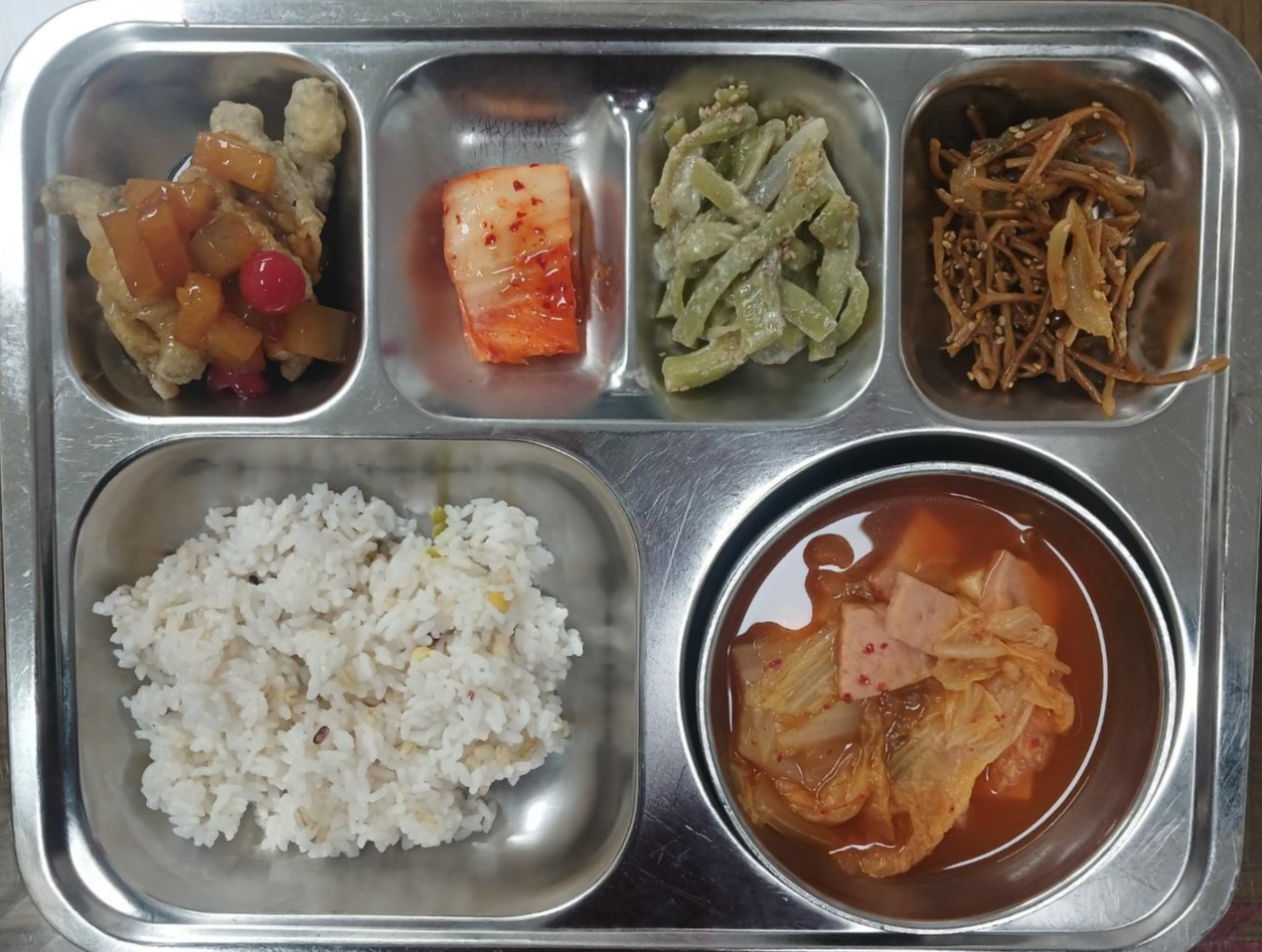 - 혼합잡곡밥, 스팸김치국, 버섯탕수, 궁채볶음, 고구마줄기무침, 배추김치