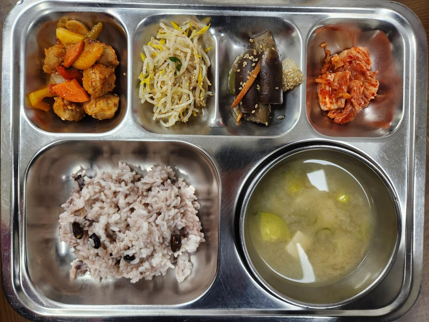 - 서리태콩밥,조갯살된장국,미트볼조림,가지나물,숙주나물무침,배추김치