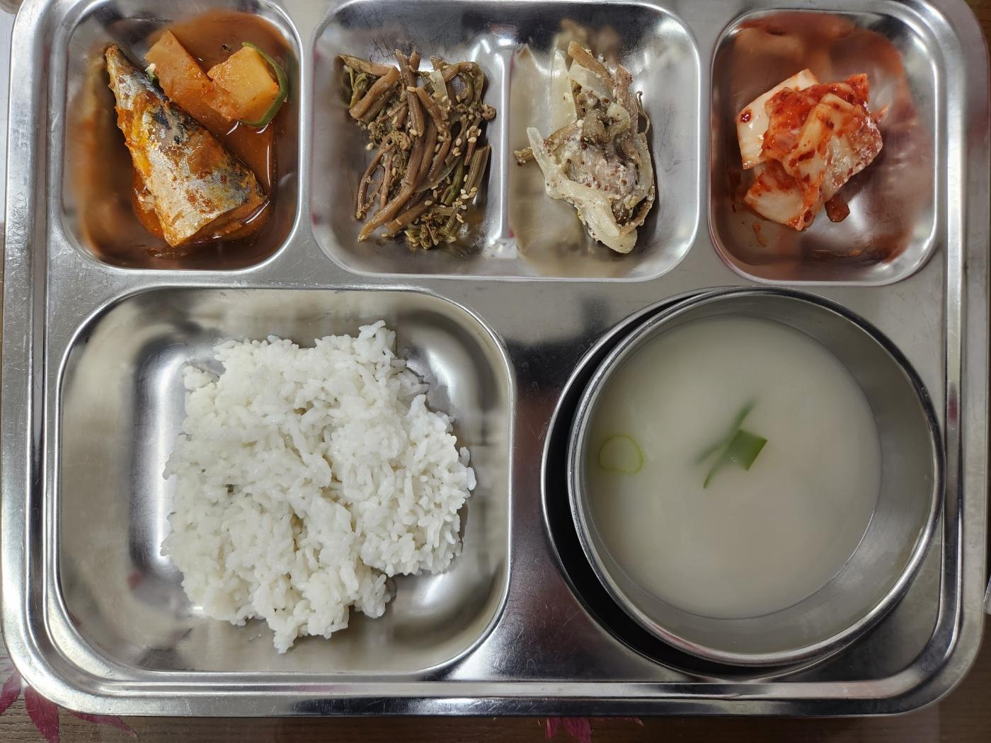 - 흰쌀밥,사골무국,고등어조림,고사리볶음,토란대볶음,배추김치