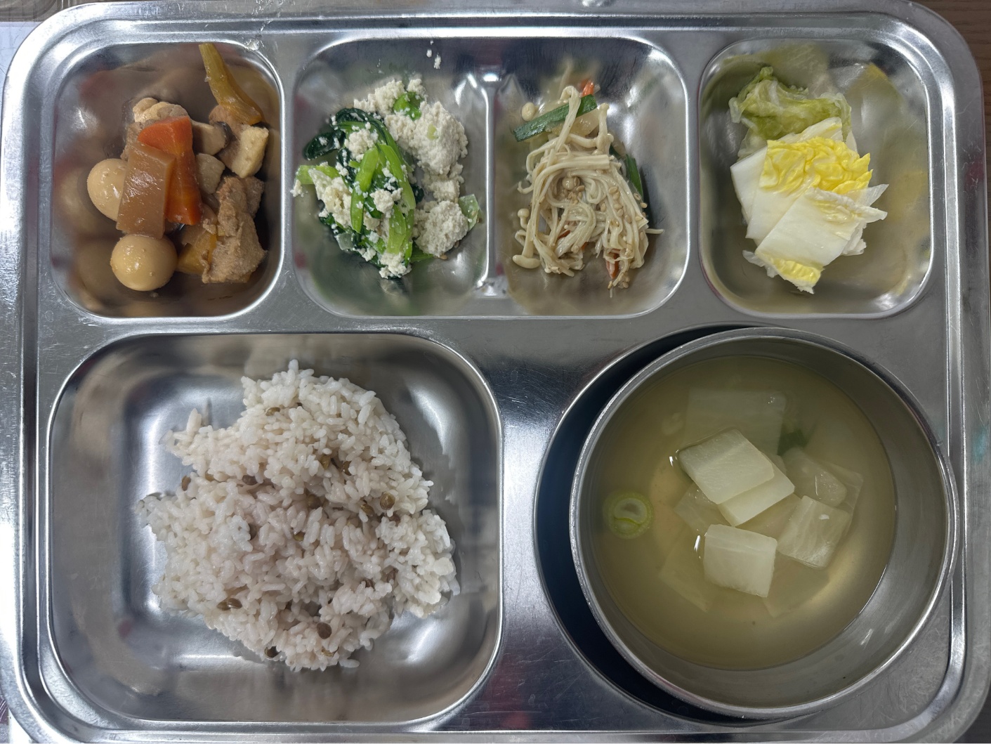 - 홍렌틸콩밥,홍합국,모듬장조림,팽이버섯볶음,비타민나물,백김치