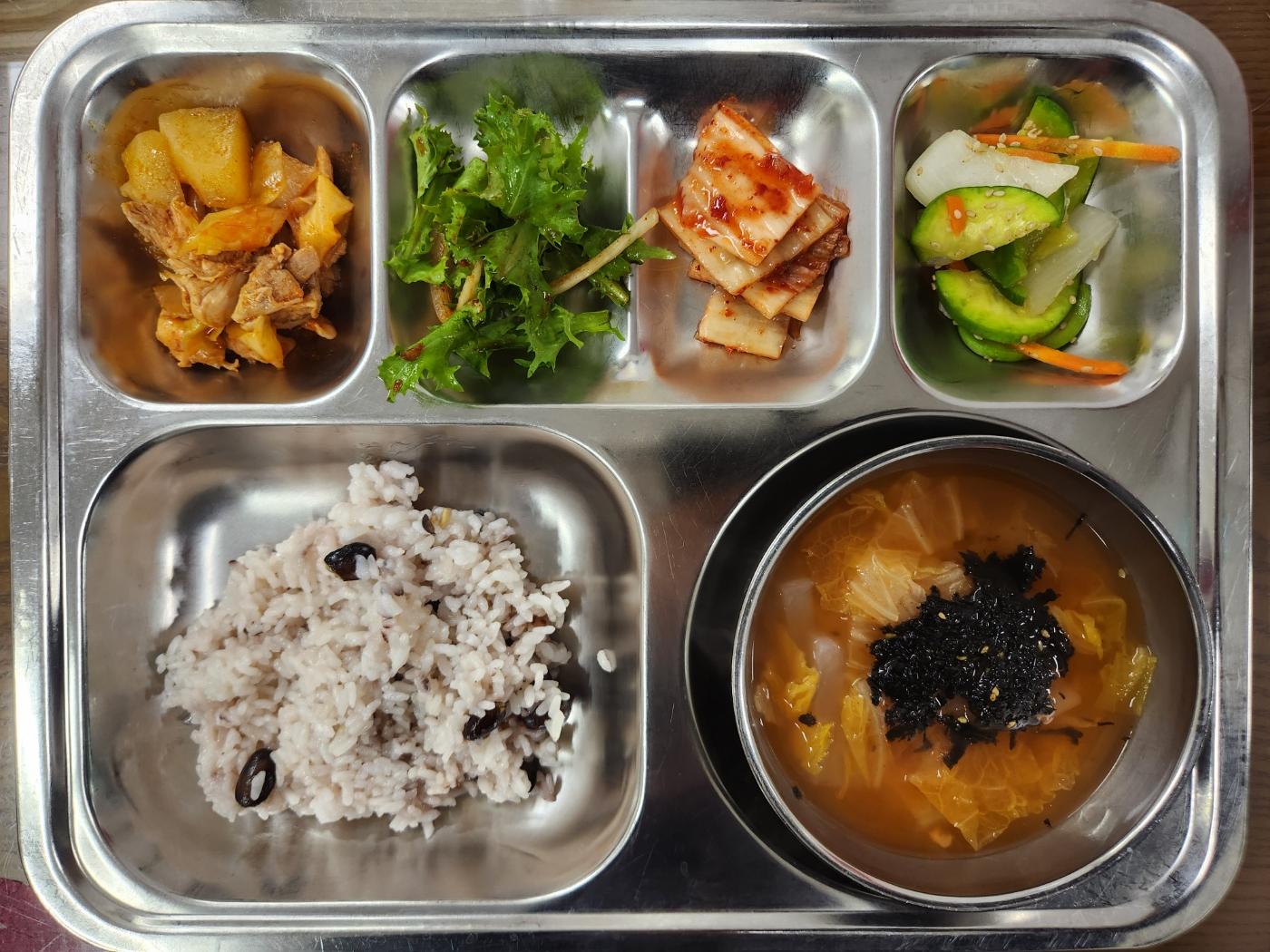 - 서리태콩밥,김청포묵국,닭볶음탕,치커리무침,애호박볶음,배추김치