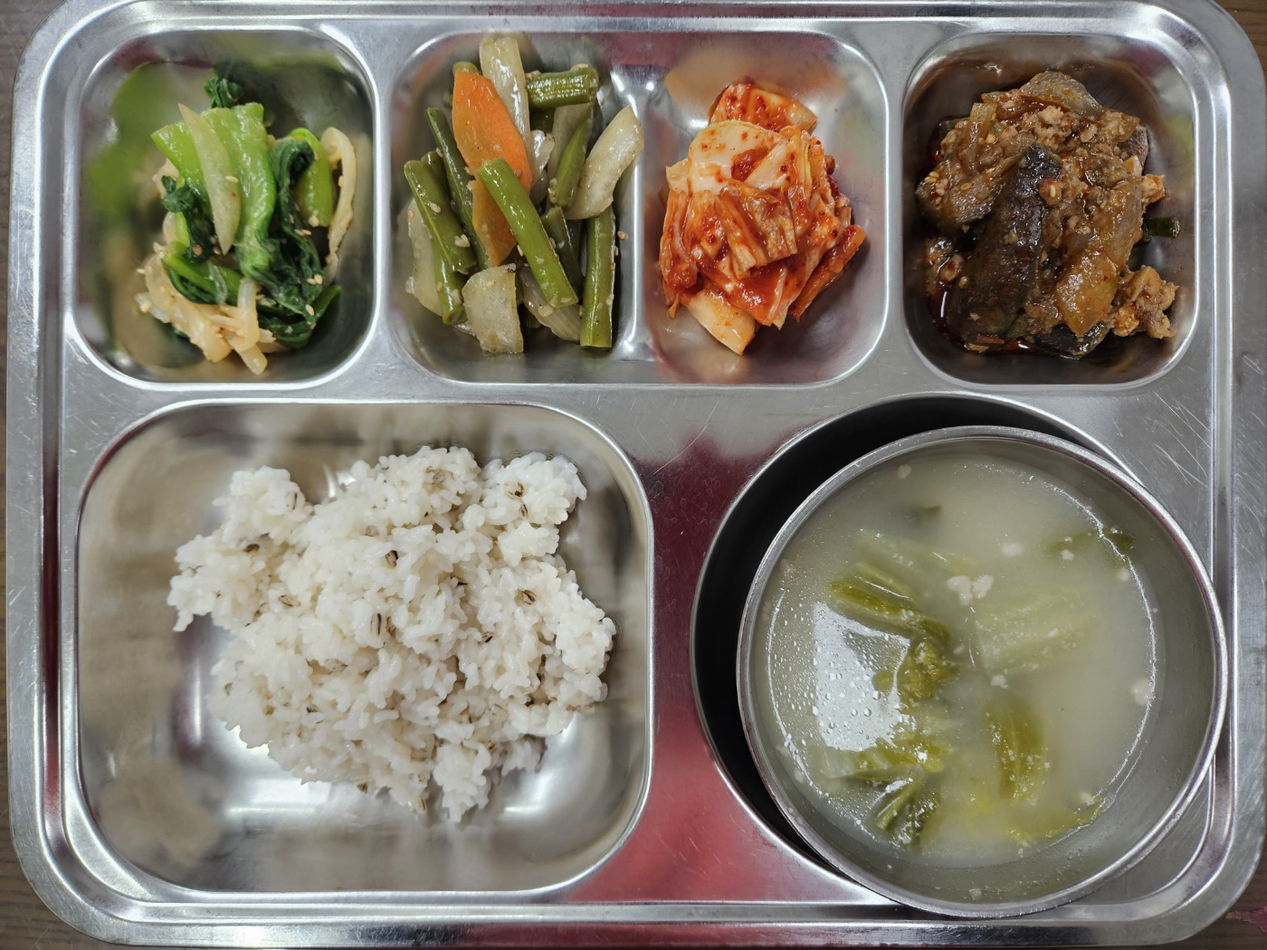 - 흑보리밥, 콩비지국, 어향가지, 그린빈볶음, 청경채된장무침, 배추김치