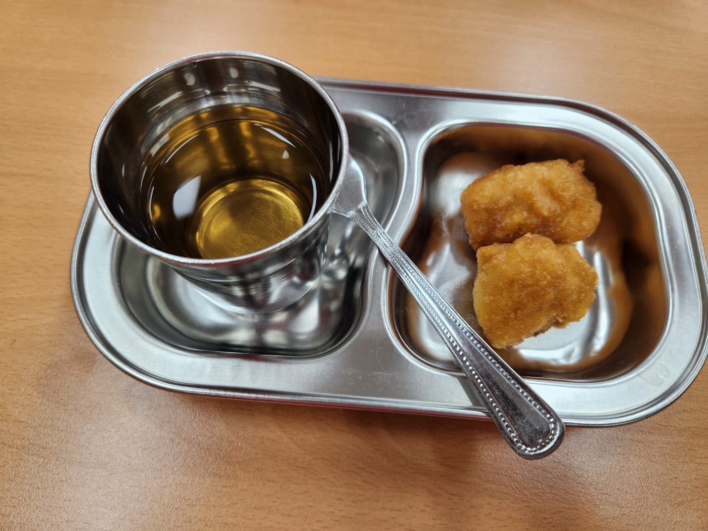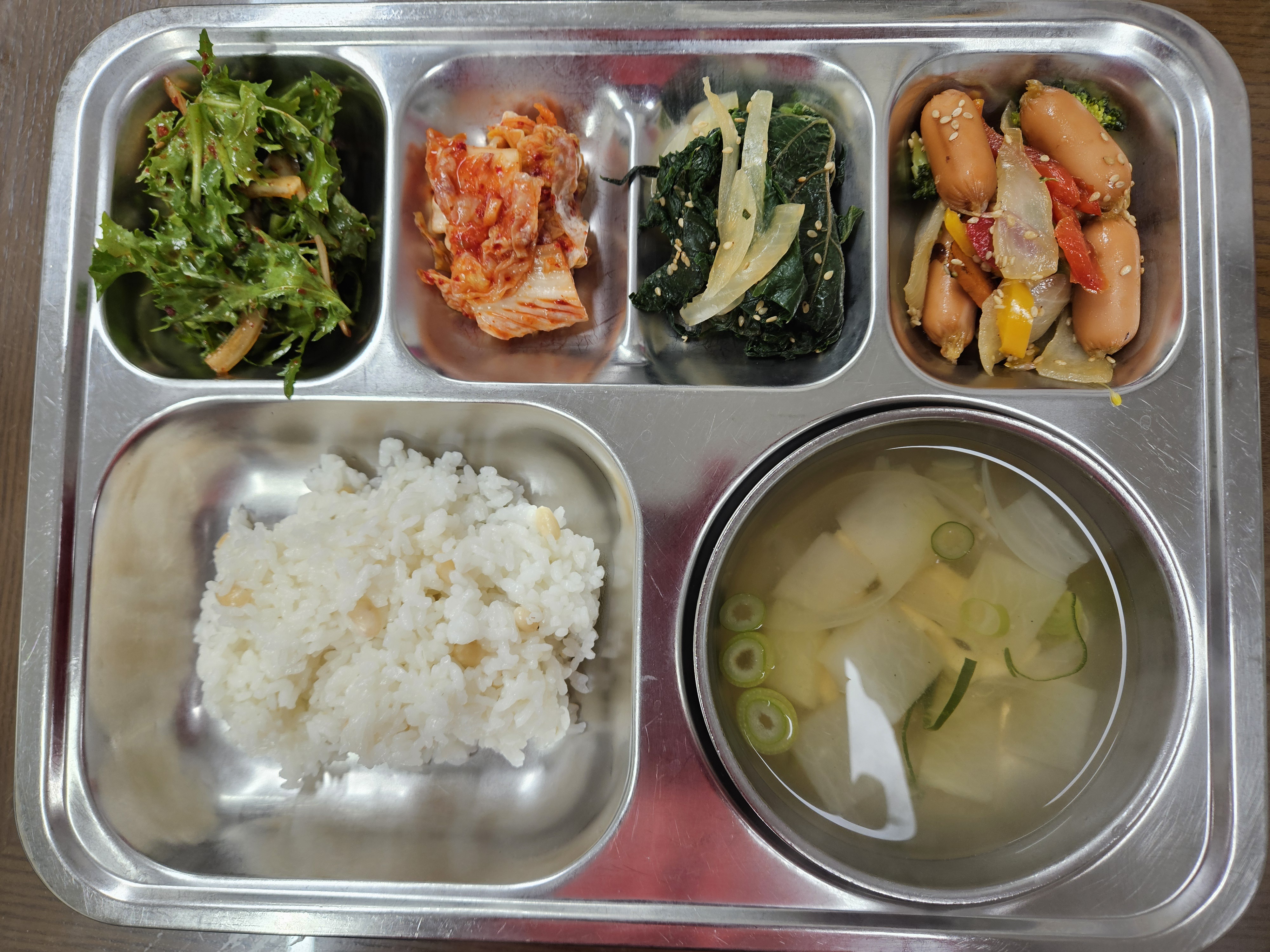 - 흰강남콩밥, 오징어무국, 비엔나피망볶음, 치커리무침, 깻잎나물, 배추김치