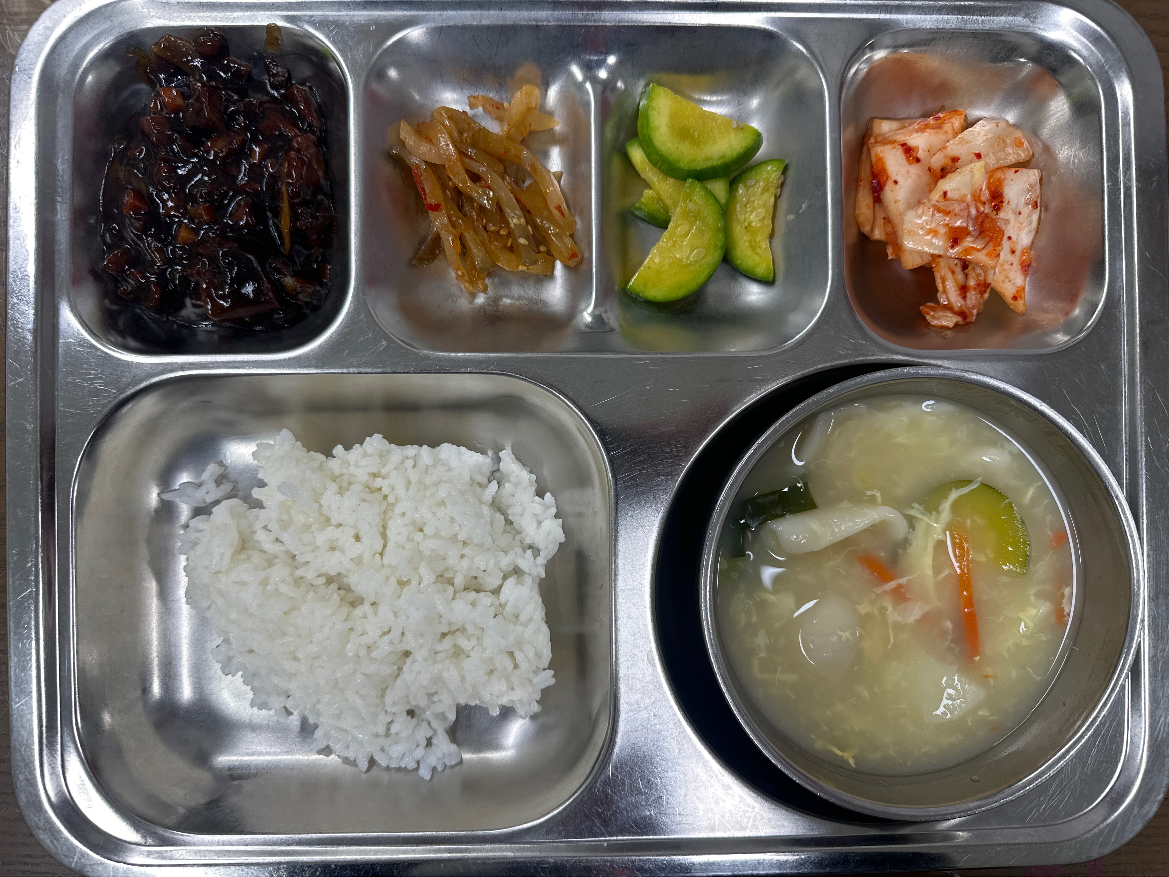 - 흰쌀밥, 감자수제비국, 자장덮밥, 새우젓호박볶음, 짜사이무침, 배추김치