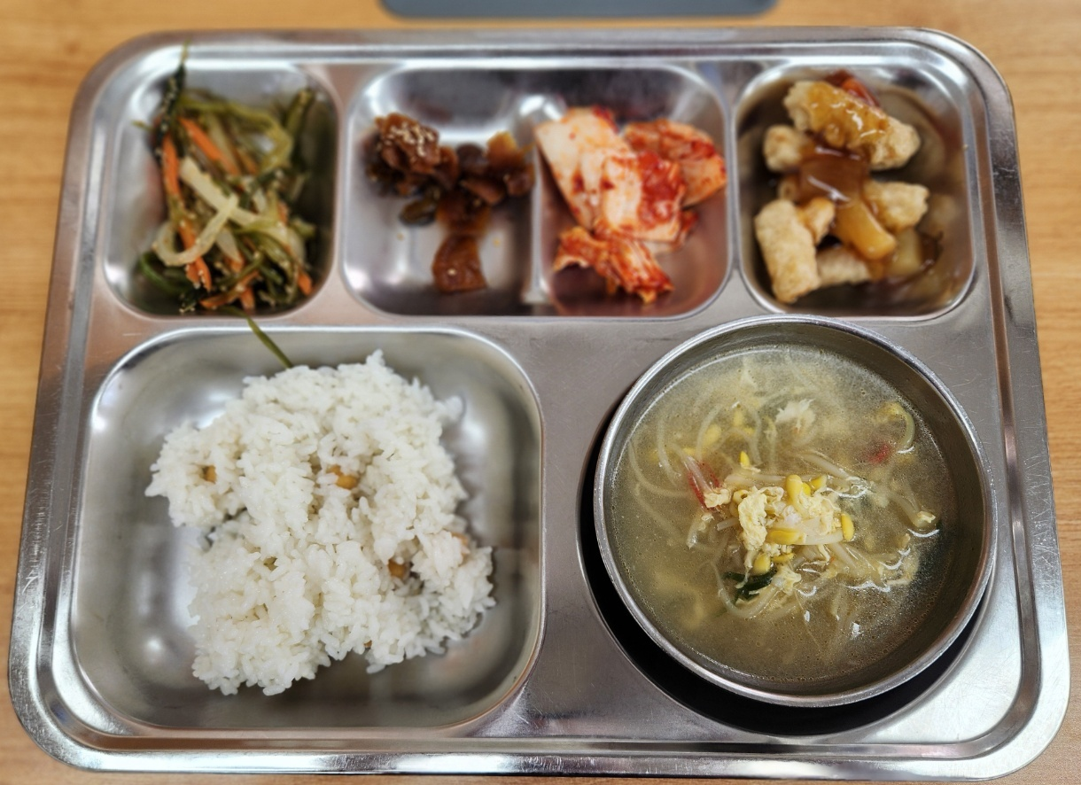 - 병아리콩밥,황태콩나물국,탕수육/소스,미역줄기볶음,비타짱아찌,배추김치