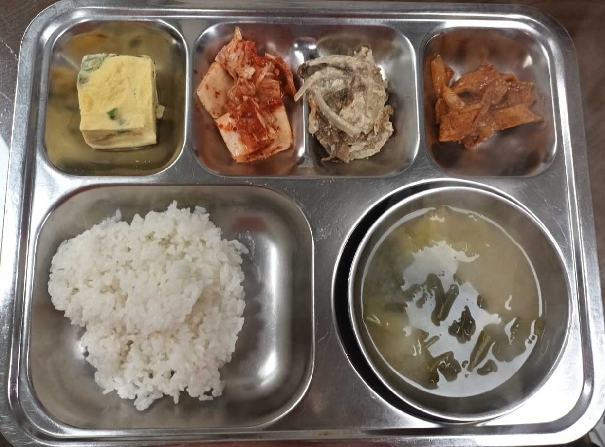 - 흰쌀밥,배추된장국,삼색계란찜,고추장어묵볶음,토란대나물,배추김치