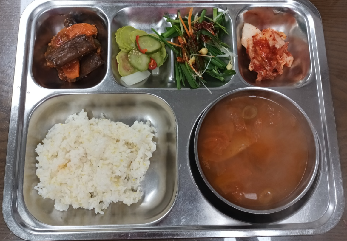 - 기장밥, 참치김치찌개, 어향가지, 오이나물, 부추무침, 배추김치
